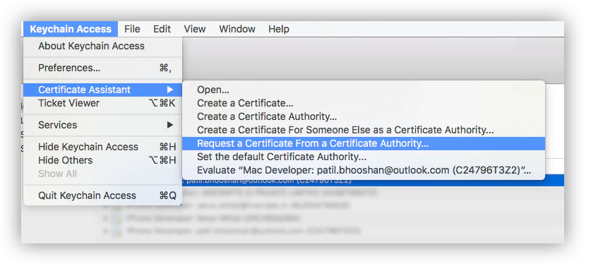 - Open Keychain Access → Certificate Assistant → Request a Certificate From a Certificate Authority.