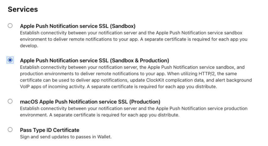 - Under Services, pick Apple Push Notification service SSL (Sandbox & Production).