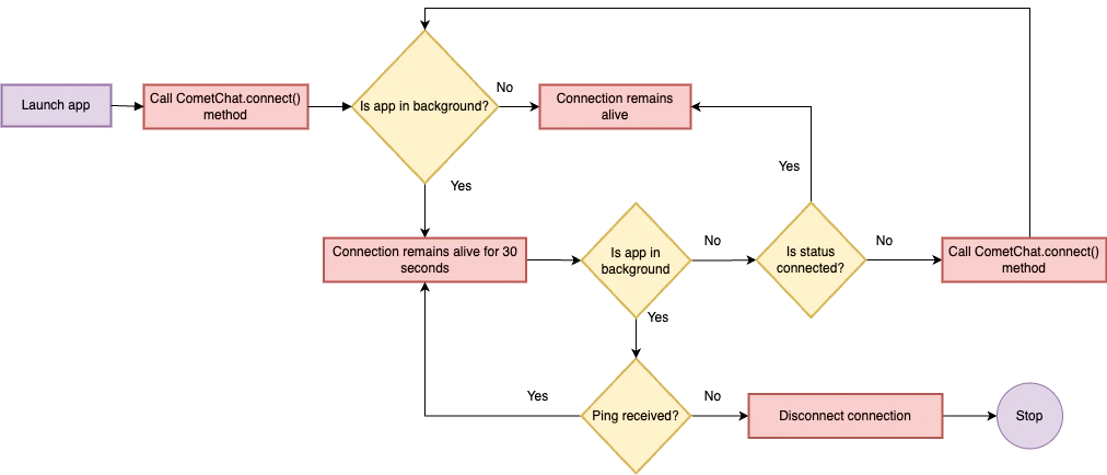 CometChat.ping() method in a loop. This will ensure that the ping message is sent to the server every 30 seconds, even if the app is not in the foreground.CometChat.ping() method within 30 seconds of your app entering the background or after the previous ping() call.