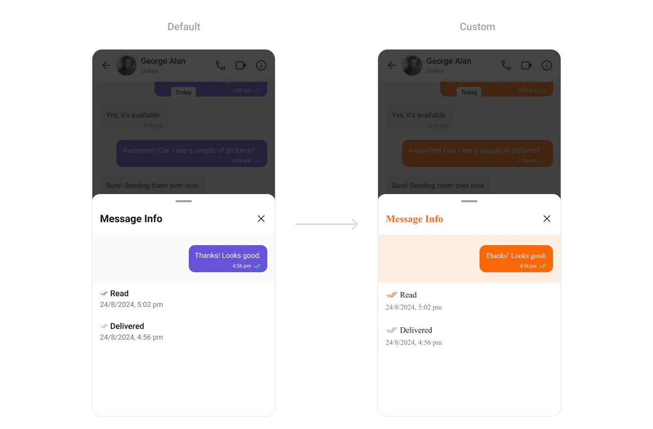 TheCometChatMessageInformation Component displays metadata for messages, such as delivery timestamps, sender details, and read receipts. Customization options include text styles, colors, and alignment, making it adaptable to various app layouts.