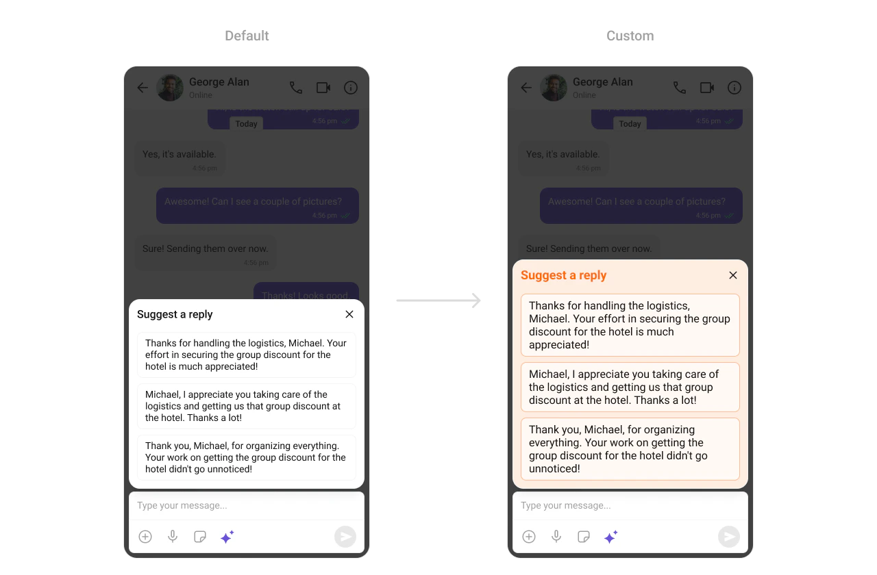TheCometChatConversationStarter Component offers AI-based suggestions or reply options to initiate a chat. Developers can customize the background, text styles, and button appearances to ensure seamless integration with the app’s visual language.