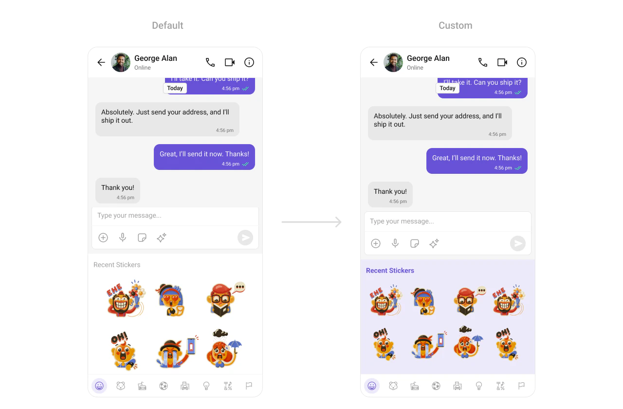 TheCometChatStickerKeyboard simplifies the integration of sticker-based messaging. Customize the background, grid layout, and sticker display styles to align with your chat experience. This component provides a visually rich and interactive way to enhance conversations.