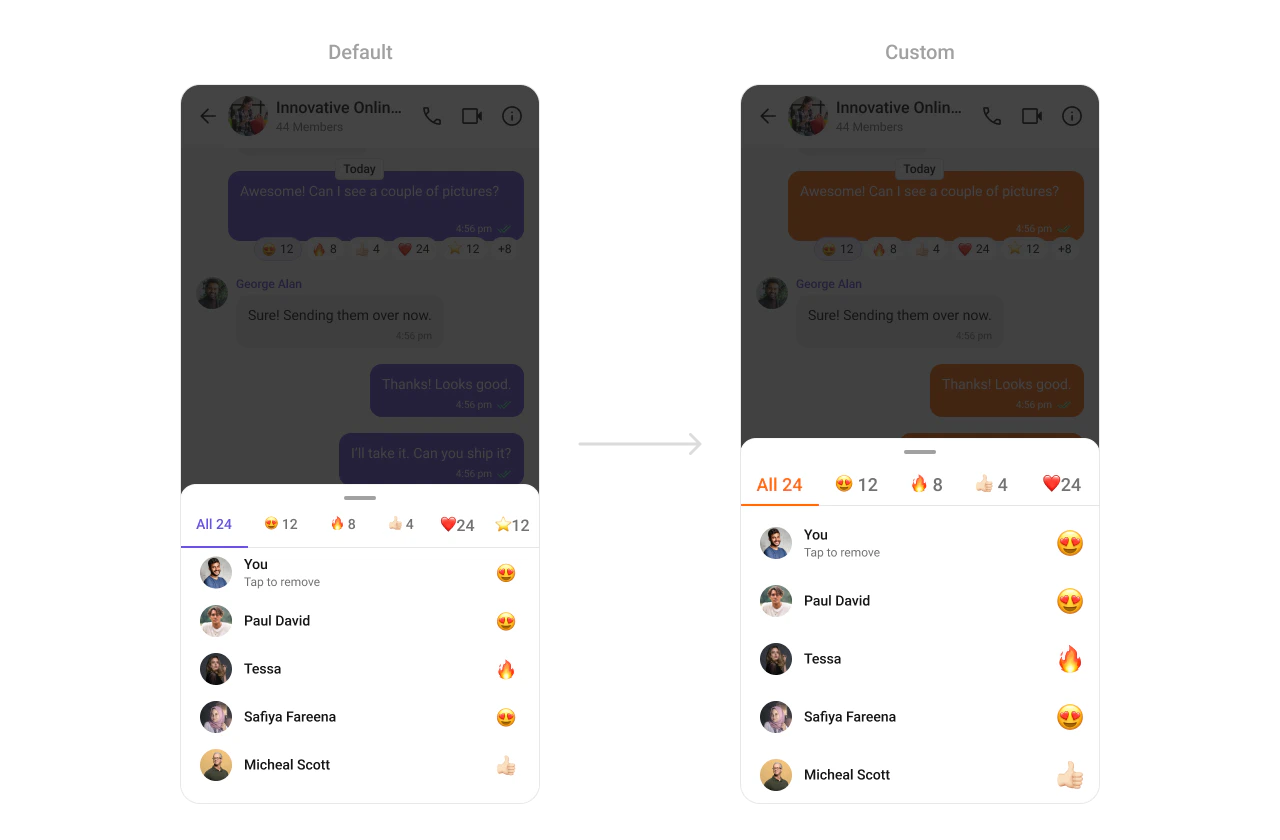 TheCometChatReactionList Component provides a visual representation of emoji reactions on messages. It supports customization for reaction sizes, spacing, and colors, enabling you to build an engaging and personalized messaging environment.
