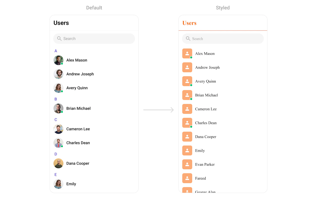 TheCometChatUsers Component displays a scrollable list of users. It is ideal for showcasing available contacts for messaging, calls, or group creation. Developers can style elements like user avatars, status indicators, and list backgrounds to align with their design guidelines.