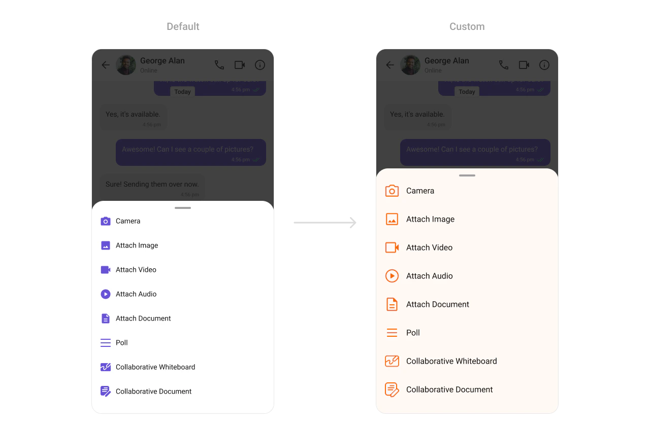 TheCometChatAttachmentOptionSheet Component provides a sleek interface for users to attach media, documents, or other files. It supports icon and text customizations to create a cohesive attachment experience.