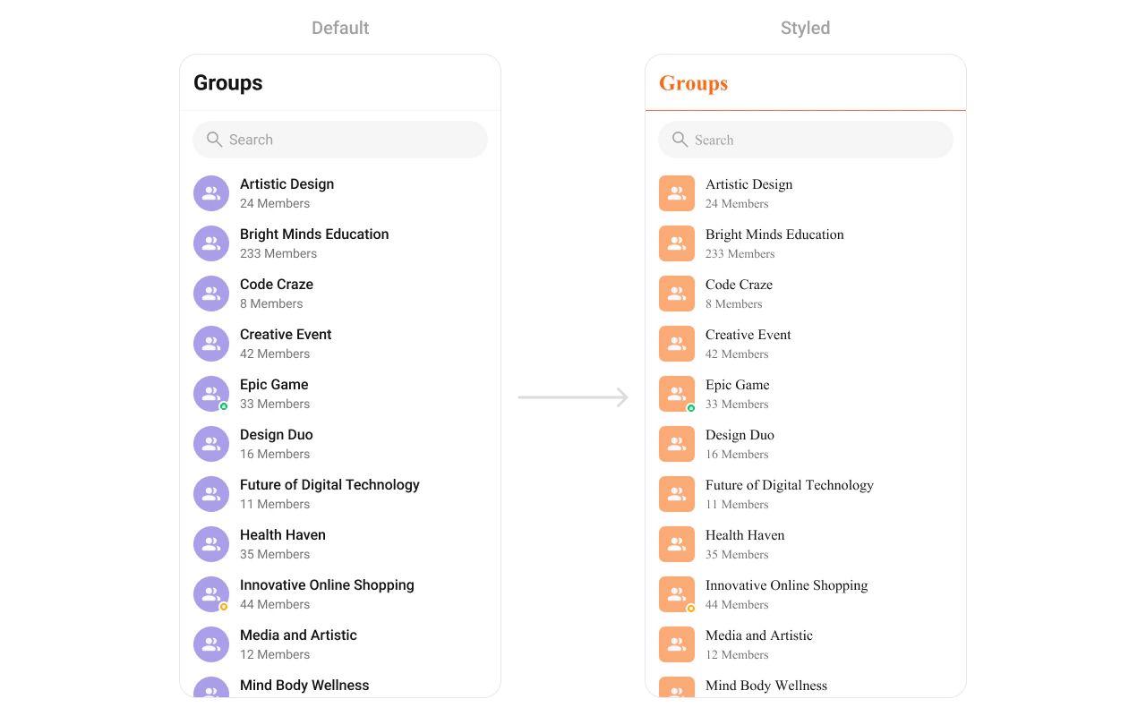 TheCometChatGroups Component allows you to display and interact with chat groups. Each group item highlights key details like the group name, participant count, and last active time. Customization options include avatar styles, fonts, borders, and background colors, ensuring the component blends seamlessly with your app.