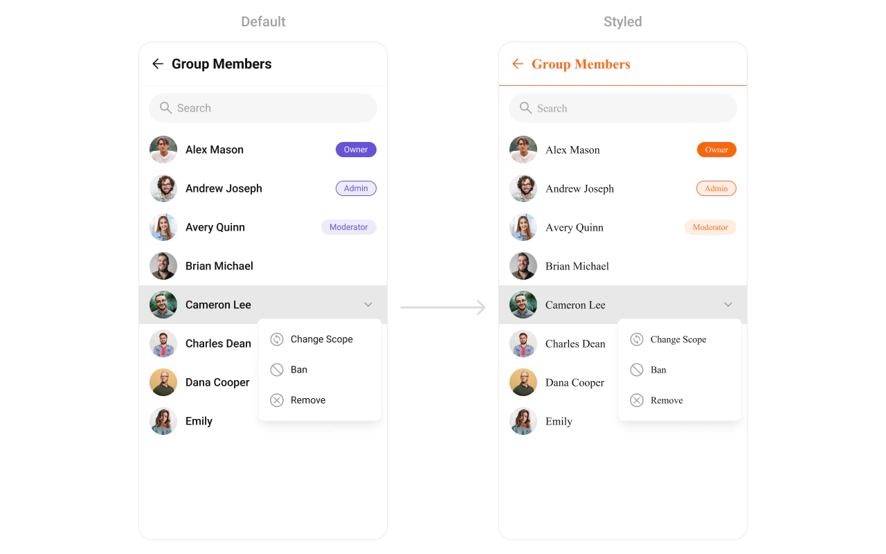 TheCometChatGroupMembers Component lists participants in a chat group with details like names, avatars, and roles (e.g., admin or member). It supports customizable styles for list items, fonts, and background colors, ensuring it integrates with your app’s group management interface.