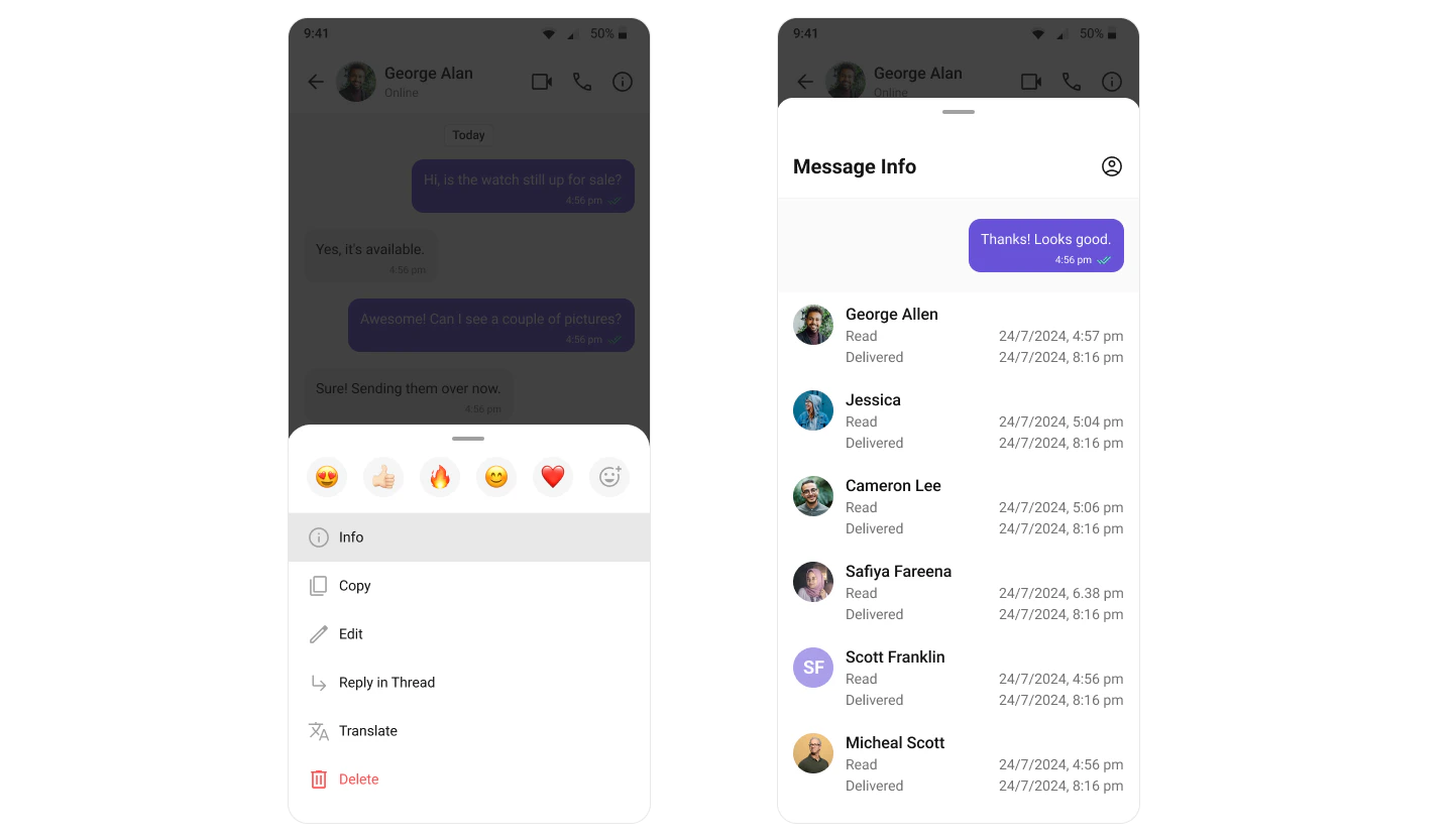 CometChat’s Read Receipts feature provides visibility into the message status, letting users know when a message has been delivered and read. This brings clarity to the communication and ensures users are informed about the status of their messages.