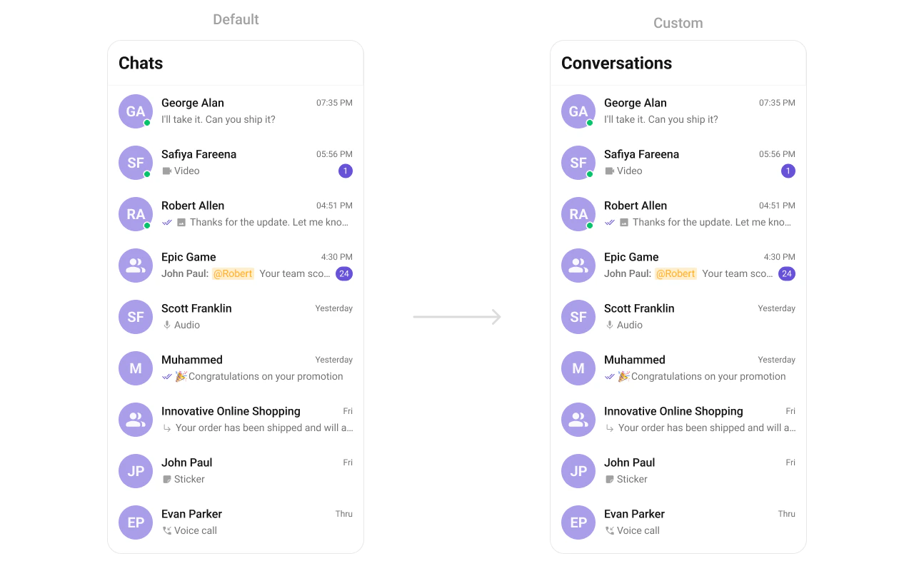 CometChatConversations component to label the chat list. Customizing the String To change this text to “Conversations”, add the following line in your app’s res/values/strings.xml file: