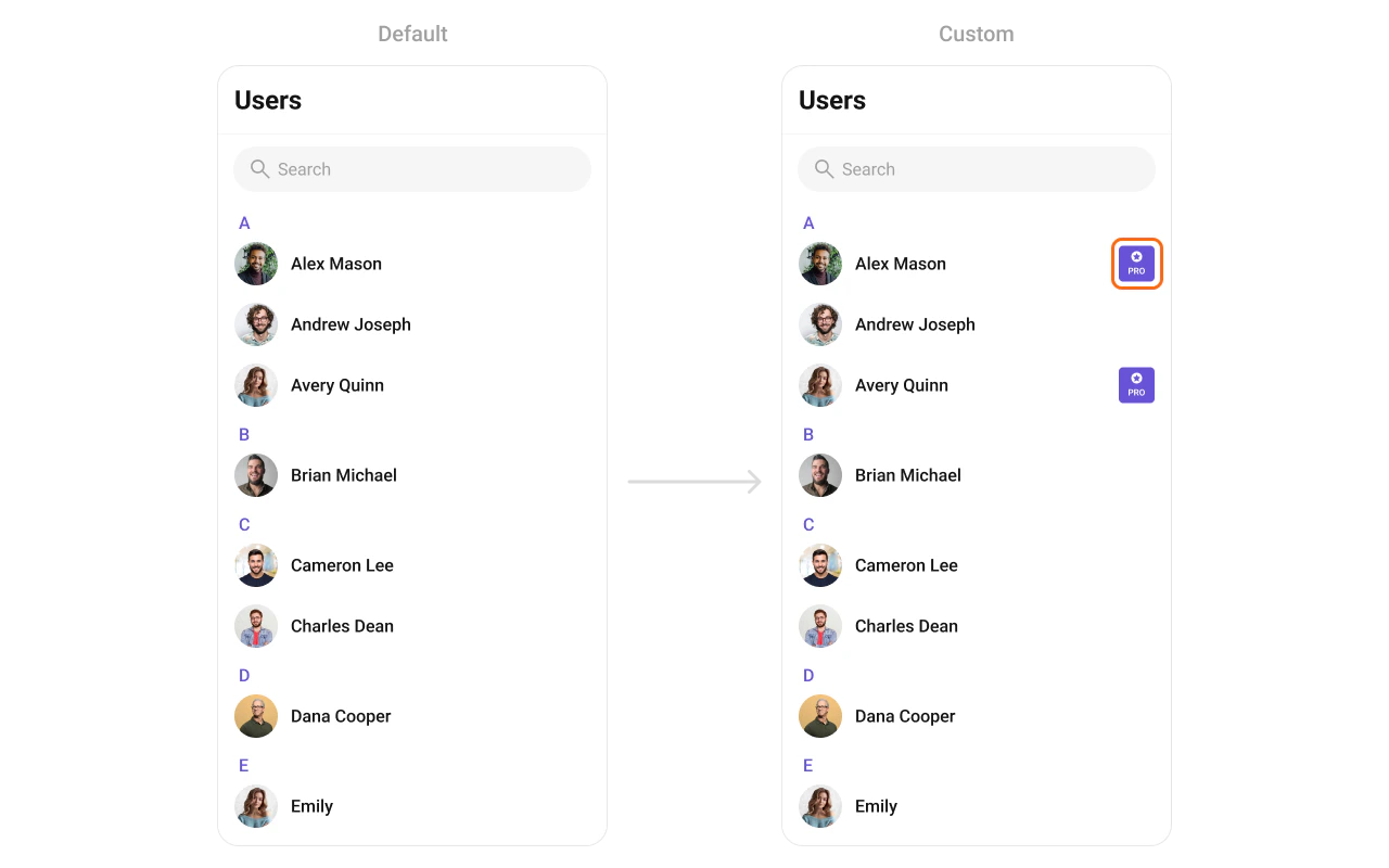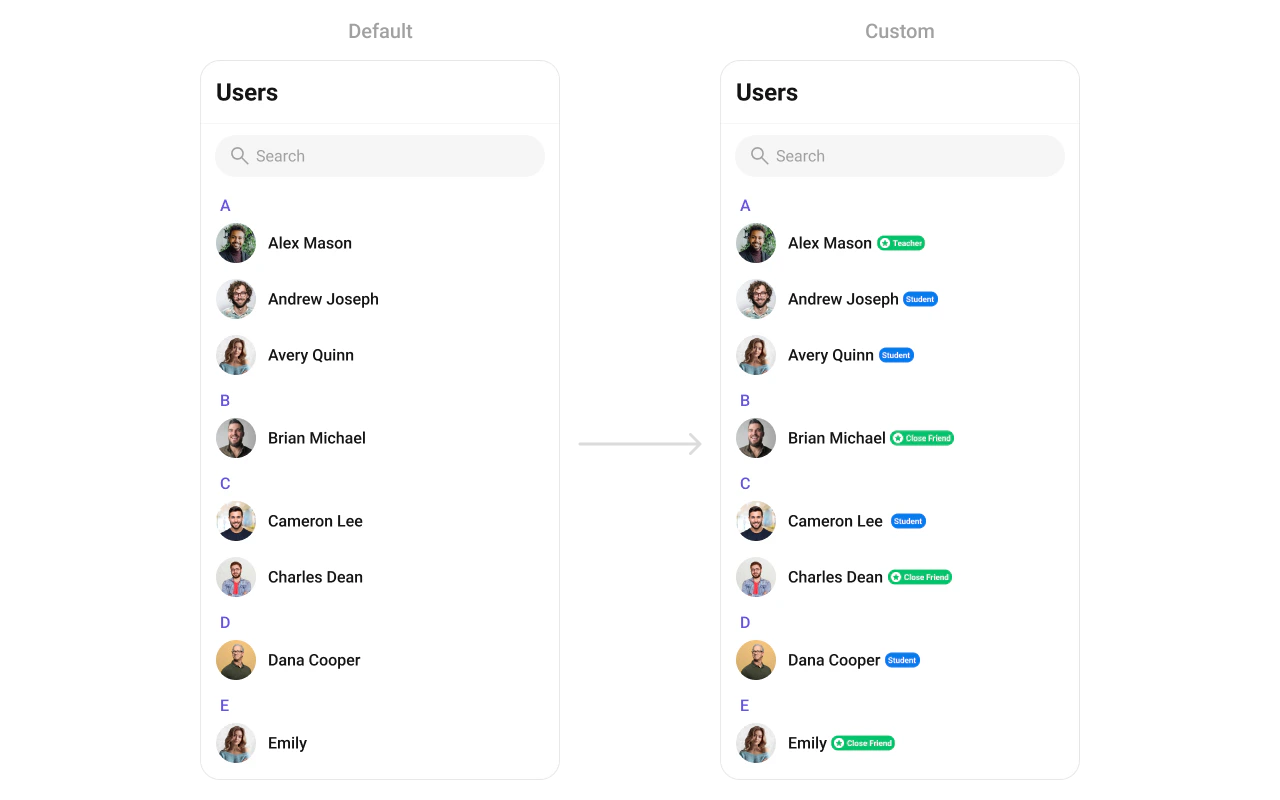 This method allows developers to assign a fully custom ListItem layout to the Users component, replacing the default design. It provides complete control over the appearance and structure of each user item in the list. Use Cases:- Customizing User Display – Modify how user information (name, avatar, status) is presented.