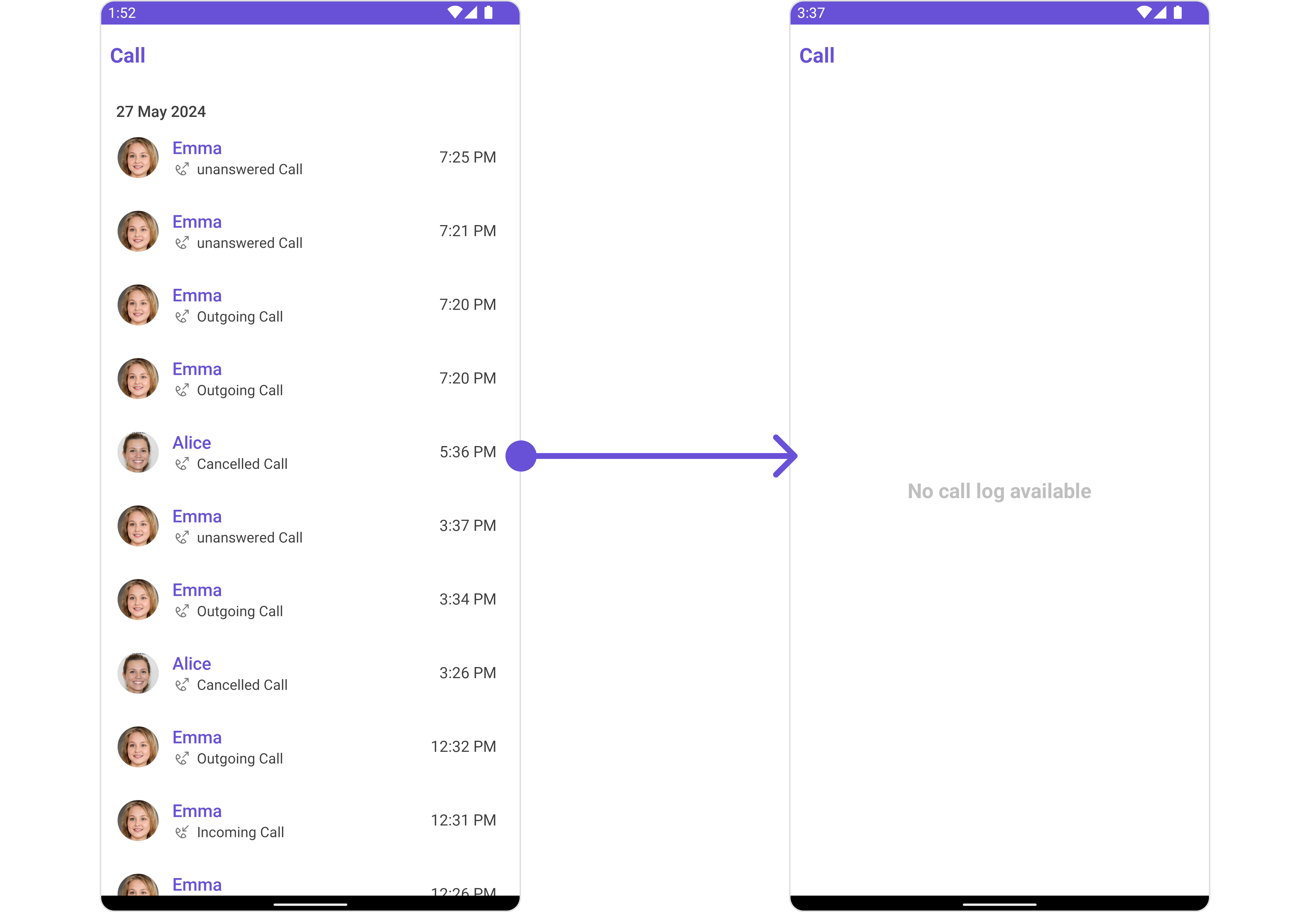 You can integrate CometChatCallLogs into your Activity and Fragment by adding the following code snippets into the respective classes.