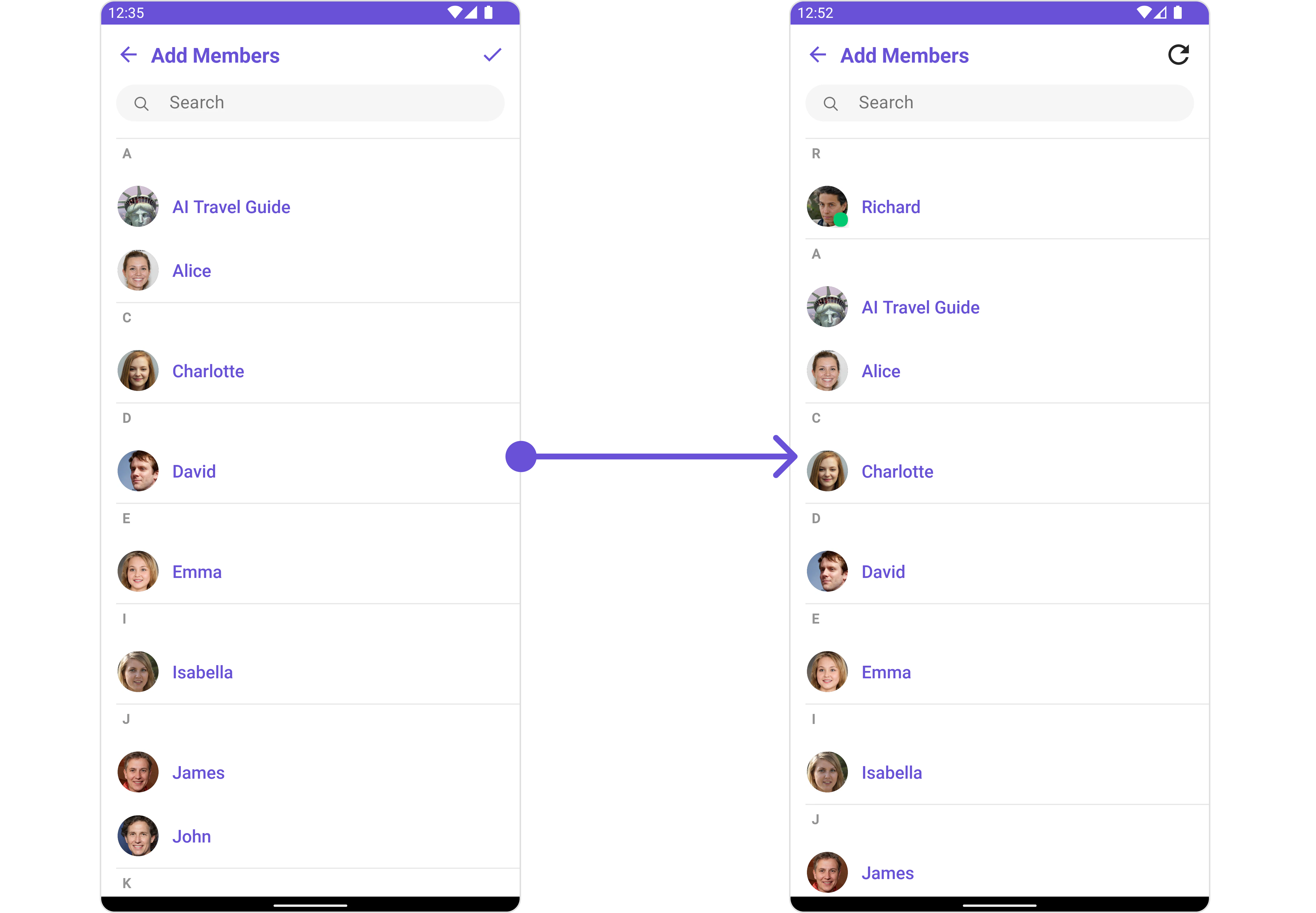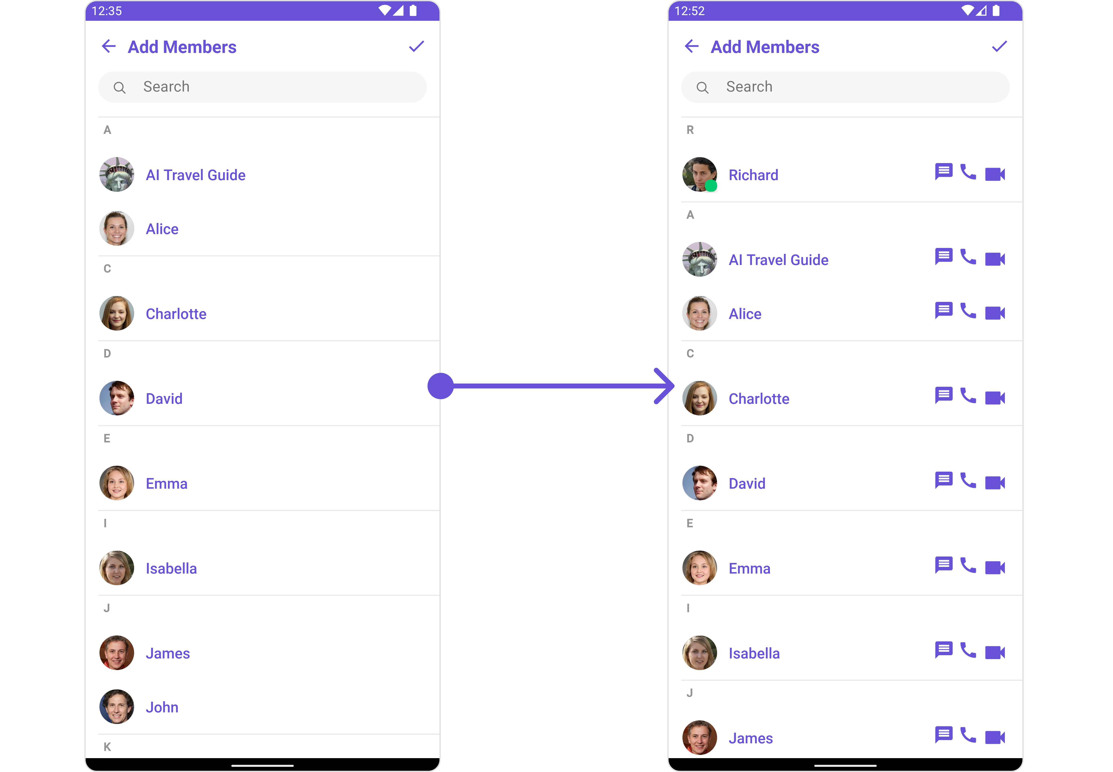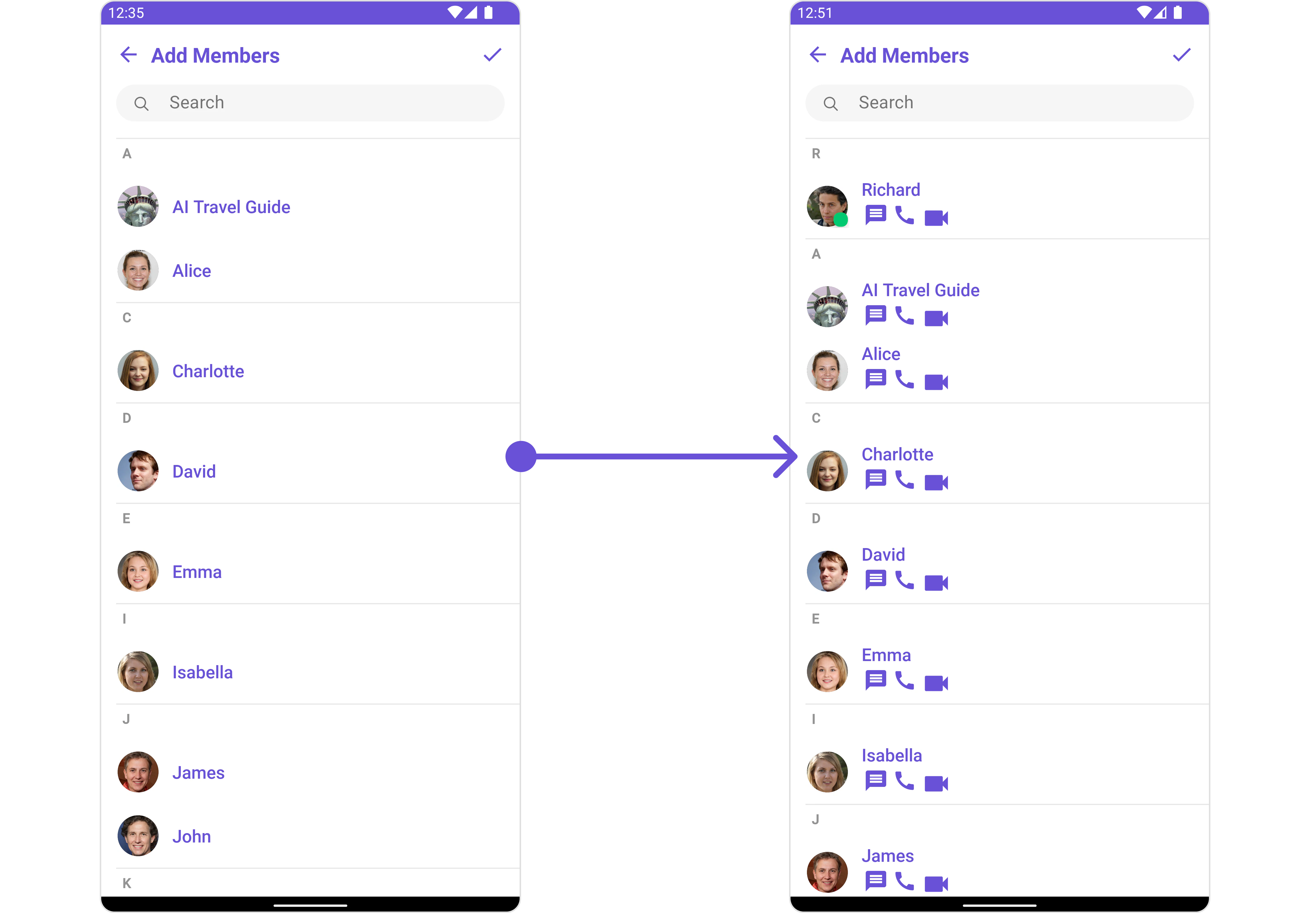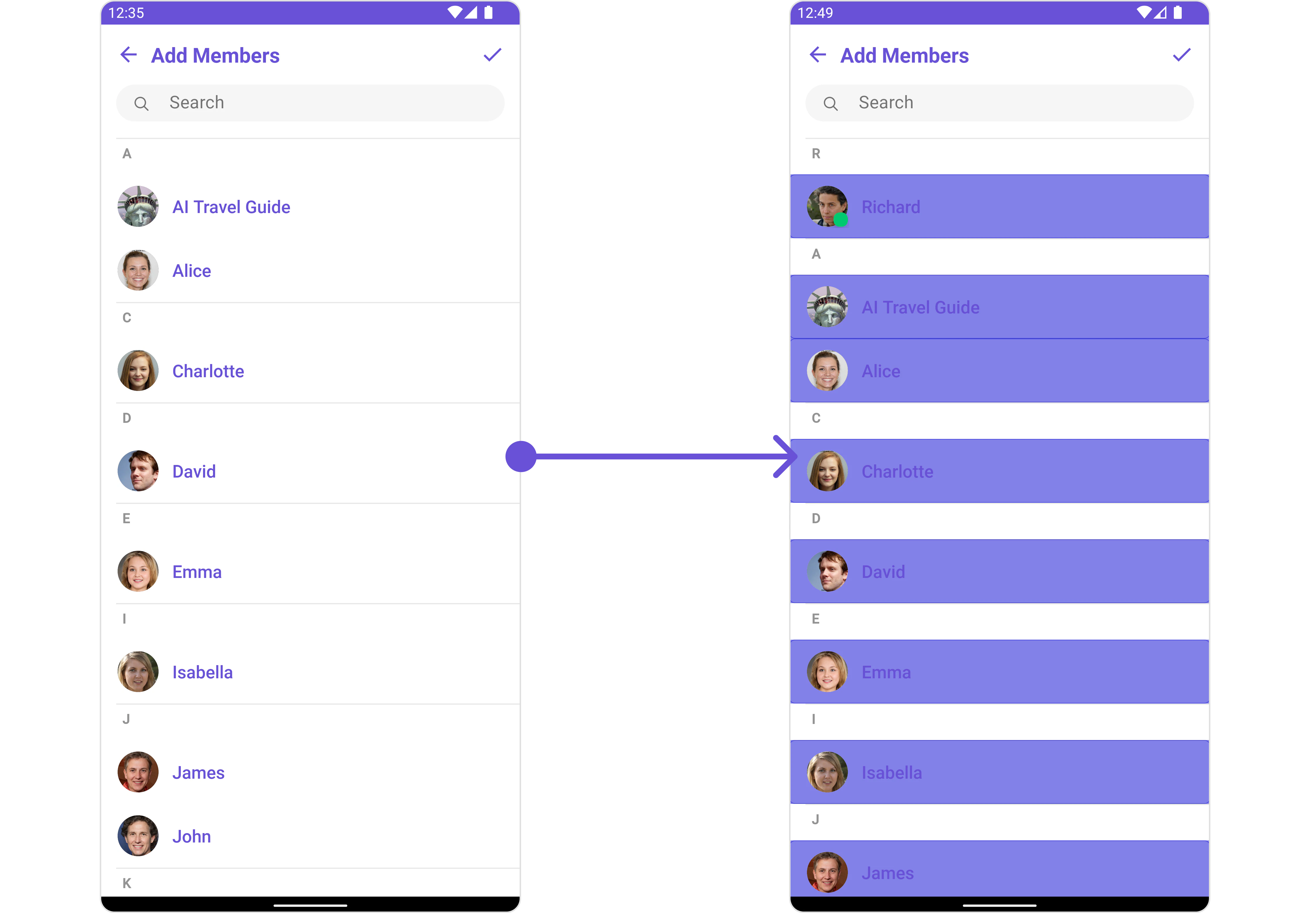 | Property | Description | Code | | --------------------------- | ----------------------------------------------------------------------------------------------------------------------------------------------- | ------------------------------------------------ | --- | | Group | The group to which the users selected will be added. A required parameter. | .setGroup(Group) | | Title | Used to set title in the app bar | .setTitle(String) | | Style | Used to set styling properties | .setStyle(AddMembersStyle) | | Avatar Style | Used to customise the Avatar of the group member | .setAvatarStyle(AvatarStyle) | | Status Indicator Style | Used to customise the status indicator shown if a group member is online | .setStatusIndicatorStyle(StatusIndicatorStyle) | | Search Placeholder Text | Used to set search placeholder text | .setSearchPlaceholderText(String) | | Back Icon | Used to set back button icon | .backIcon(@DrawableRes int res) | | Show Back Button | Used to toggle visibility for back button | .showBackButton(boolean) | | Search Box Icon | Used to set search Icon in the search field | .setSearchBoxIcon(@DrawableRes int res) | | Hide Search | Used to toggle visibility for search box | .hideSearch(boolean) | | Hide Error | Used to hide error on fetching users and failing to add selected users to the group. | .hideError(boolean) | | Hide Separator | Used to hide the divider separating the user items | .hideSeparator(boolean) | | Hide Section Separator | Used to hide the text separating grouped user items | .hideSectionSeparator(boolean) | | Disable Users Presence | Used to control visibility of user indicator shown if user is online | .disableUsersPresence(boolean) | | Selection Icon | Used to override the default selection complete icon | .setSelectionIcon(@DrawableRes int res) | | Submit Icon | Used to override the default selection complete icon | .setSubmitIcon(@DrawableRes int res) | | Selection Mode | Used to set the number of users that can be selected. By default it is SelectionMode.multiple. SelectionMode can be single, multiple or none. | .setSelectionMode(SelectionMode) | |