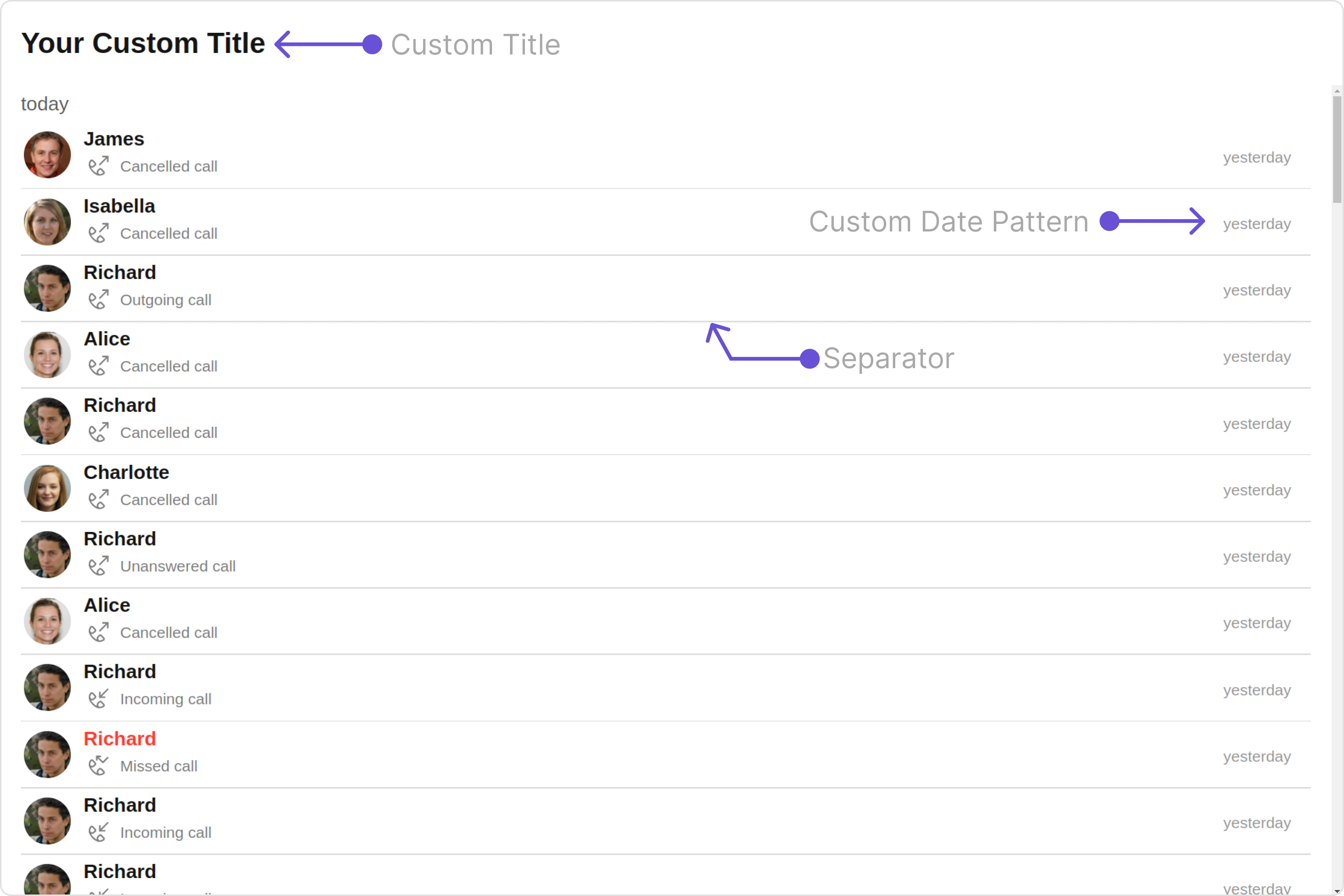 With this property, you can assign a custom ListItem to the Call Logs Component. Example Default: