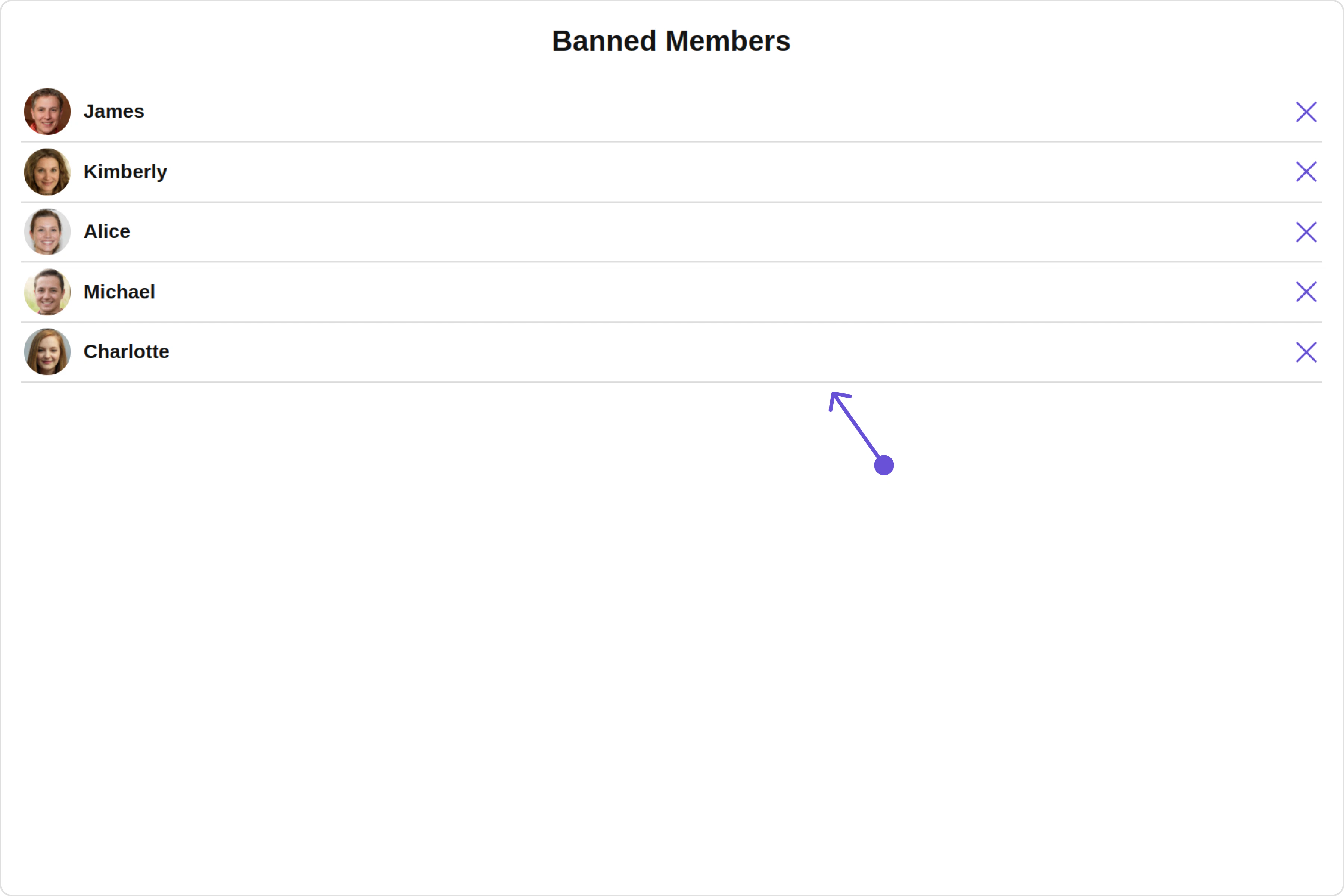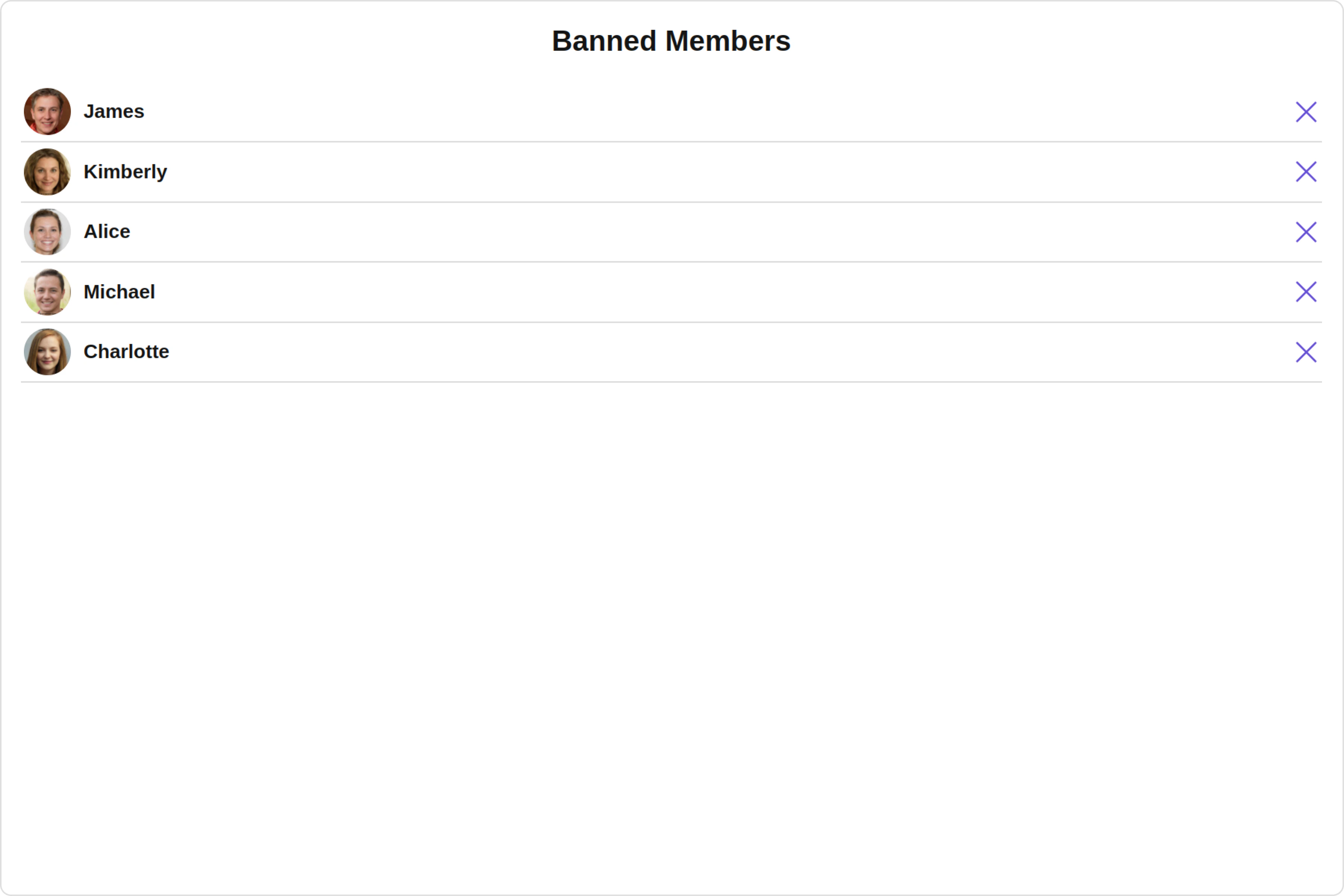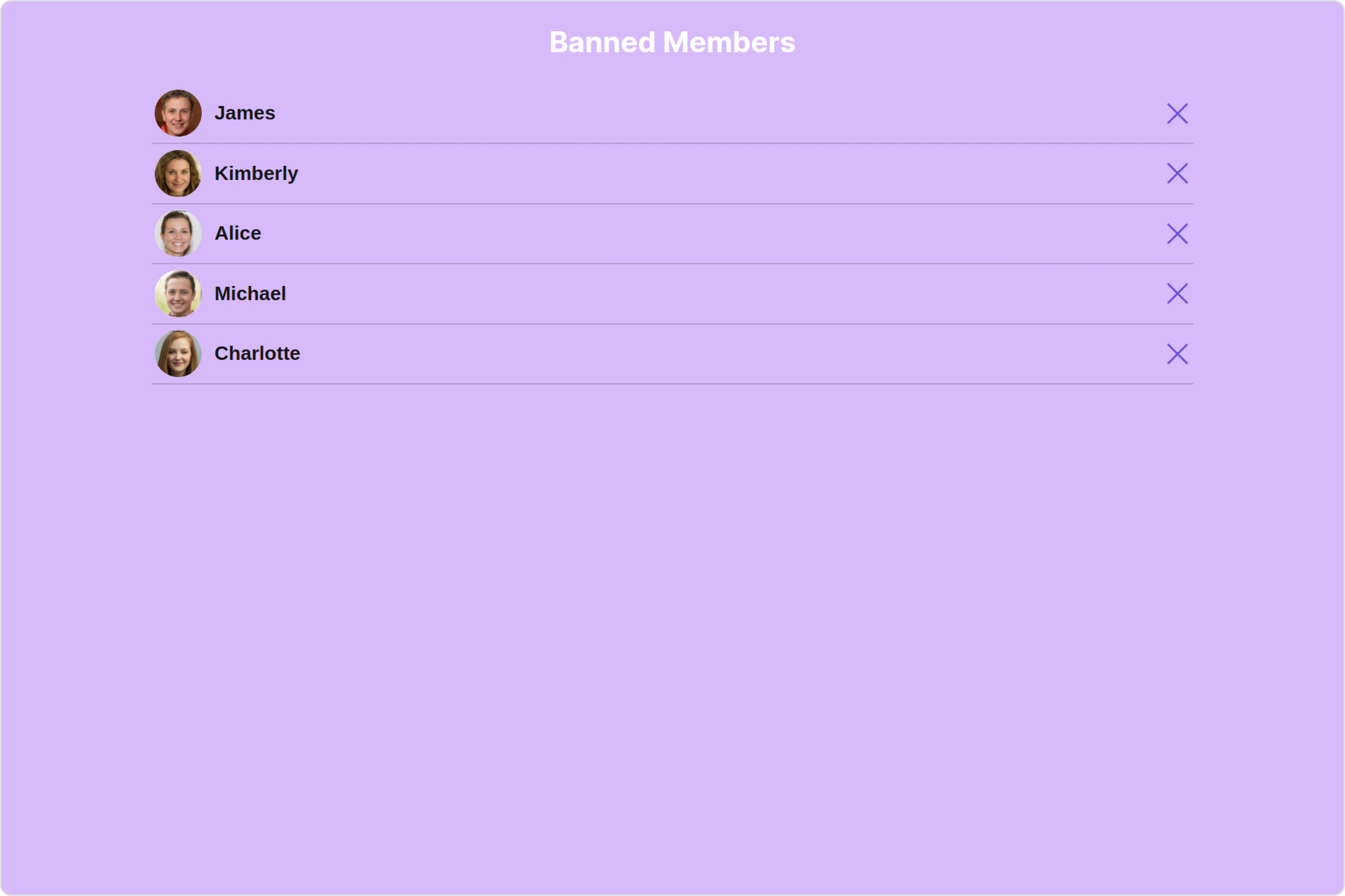 With this property, you can assign a custom ListItem to the Banned Members Component. Example Default: