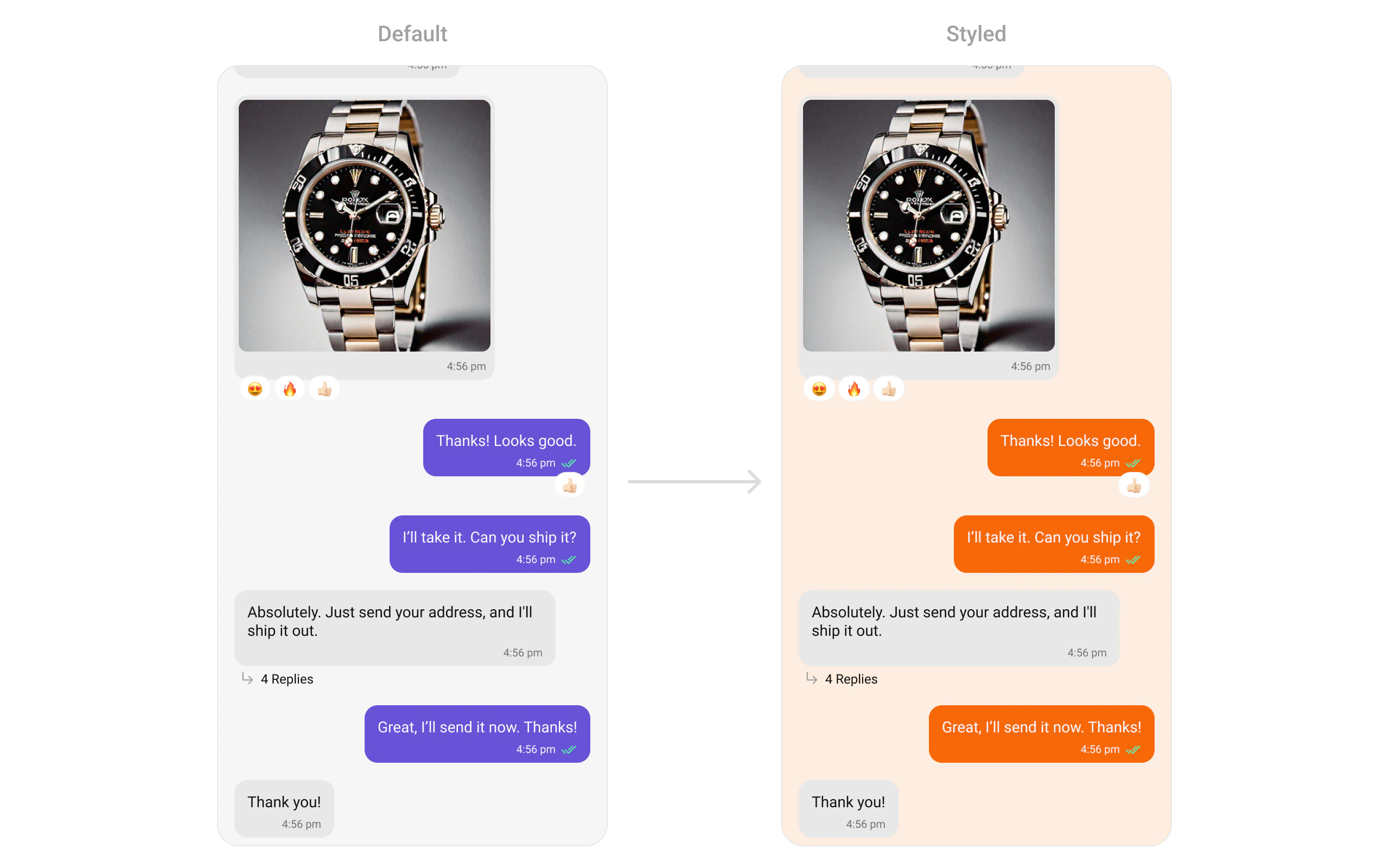 Customize the appearance of message lists, including bubble styles, timestamps, and reactions.