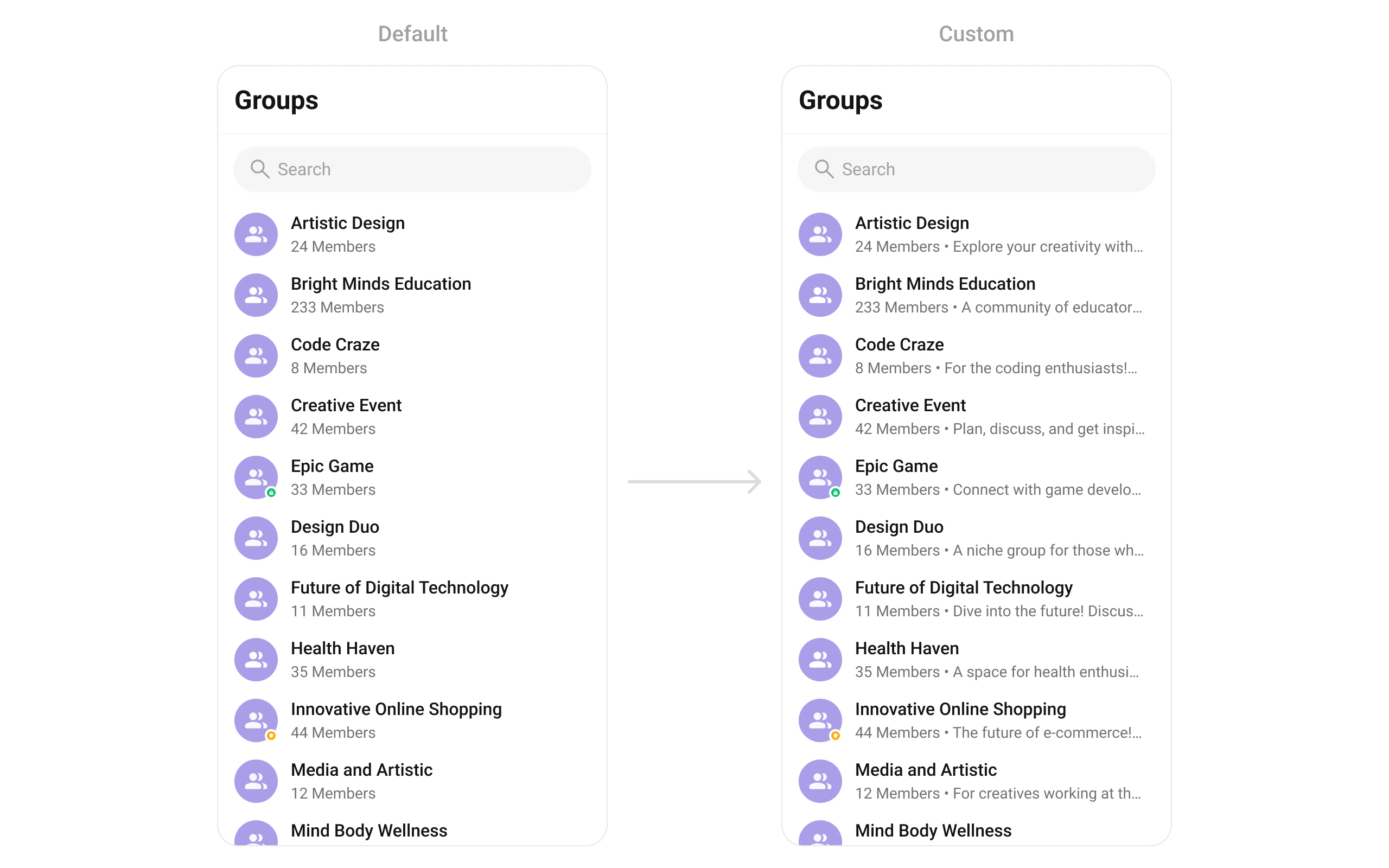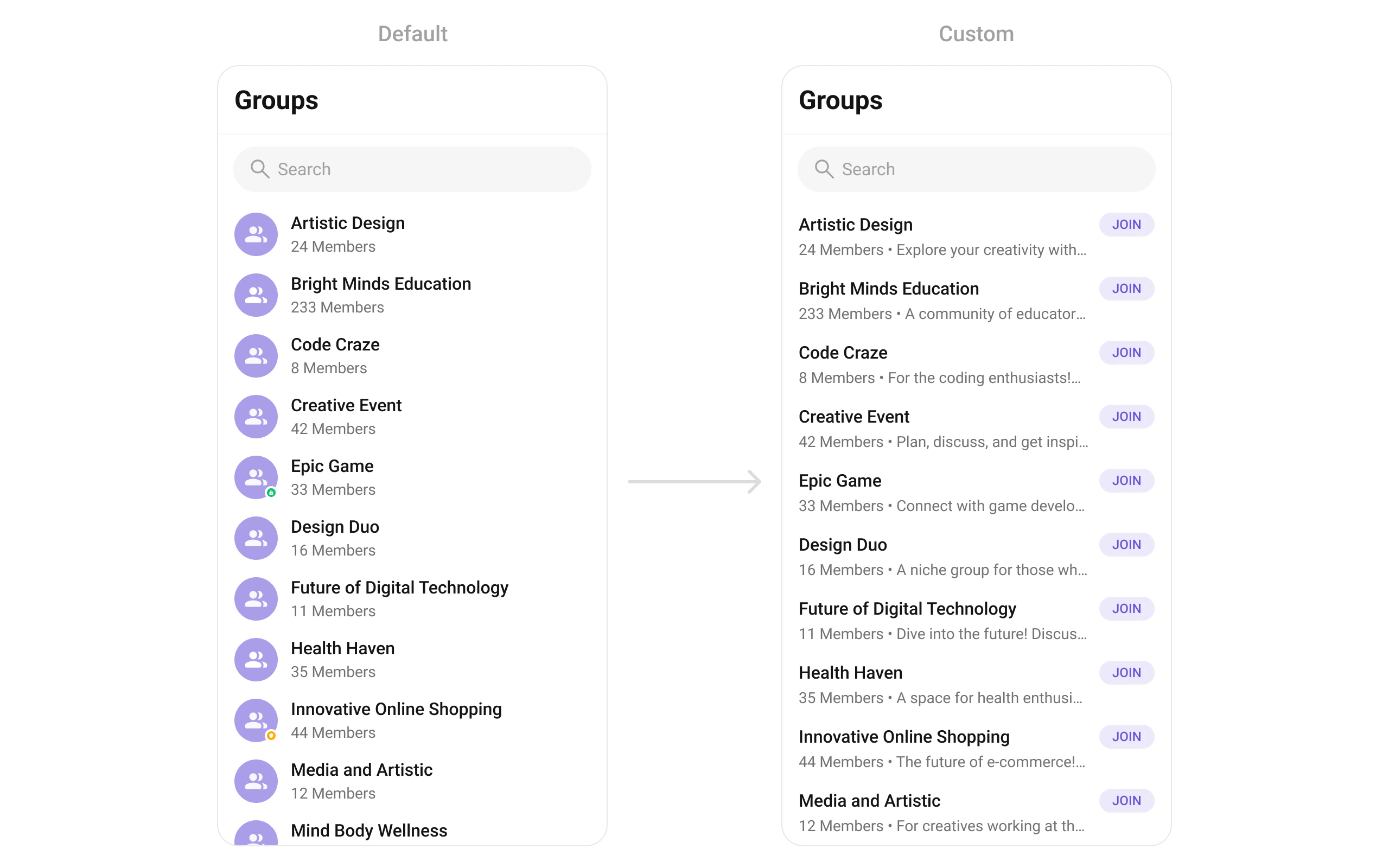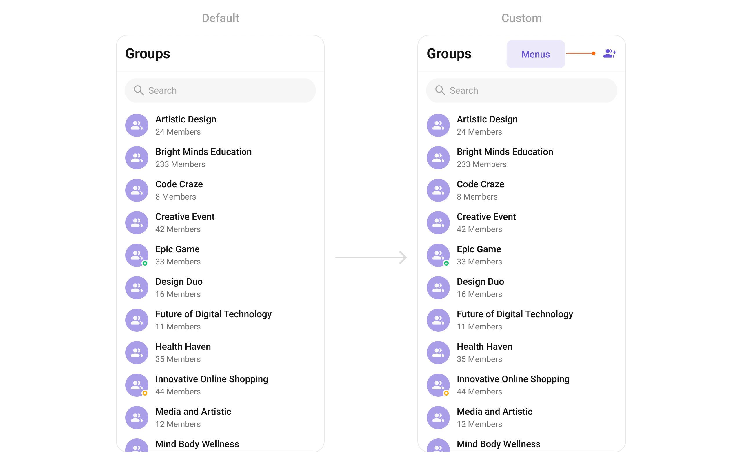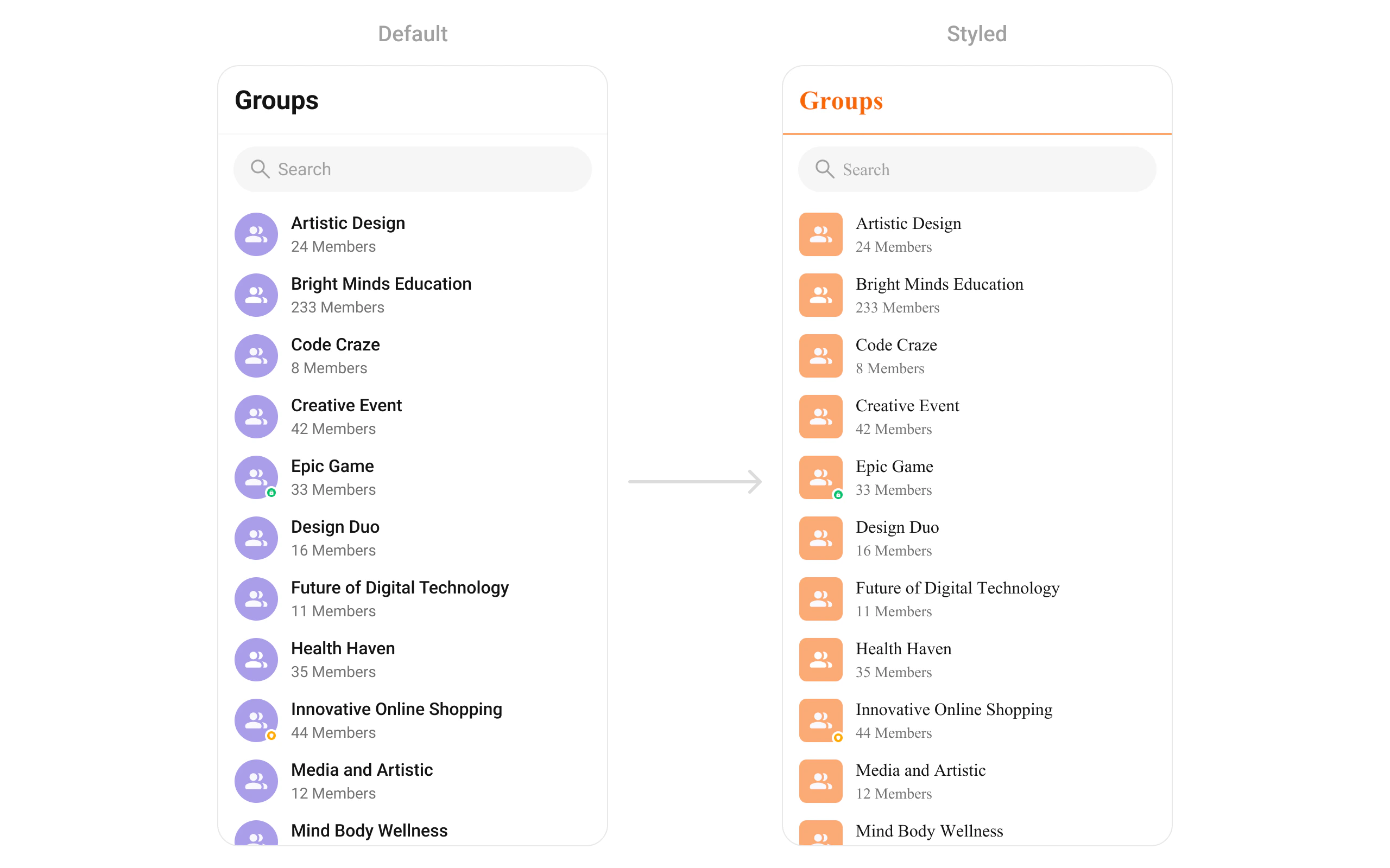 To fit your app’s design requirements, you can customize the appearance of the groups widget. We provide exposed methods that allow you to modify the experience and behavior according to your specific needs.Style