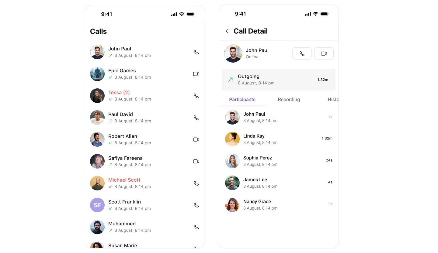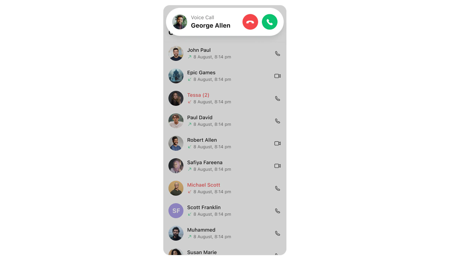 Call Logs component provides you with the records call events such as who called who, the time of the call, and the duration of the call. This information can be fetched from the CometChat server and displayed in a structured format for users to view their past call activities.