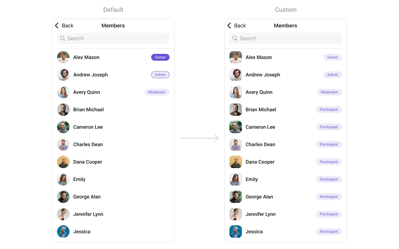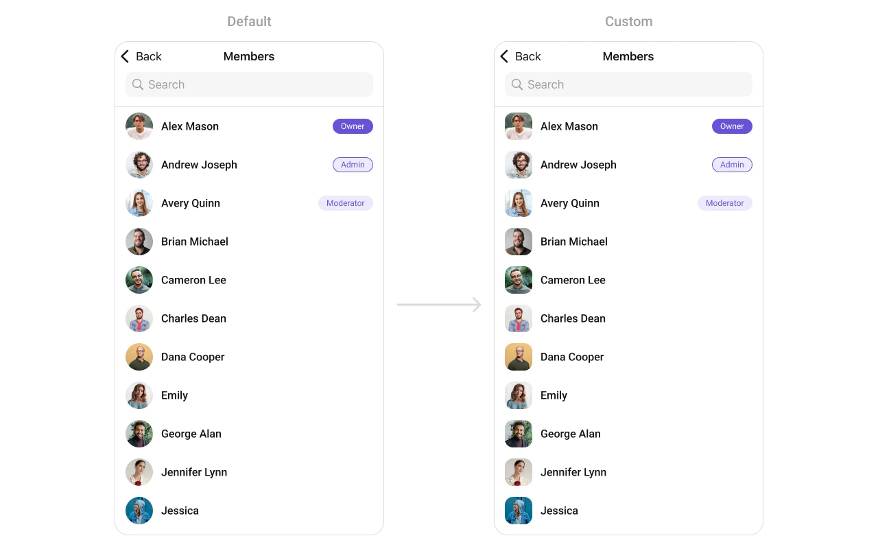 To fit your app’s design requirements, you can customize the appearance of the Groups component. We provide exposed methods that allow you to modify the experience and behavior according to your specific needs.Style