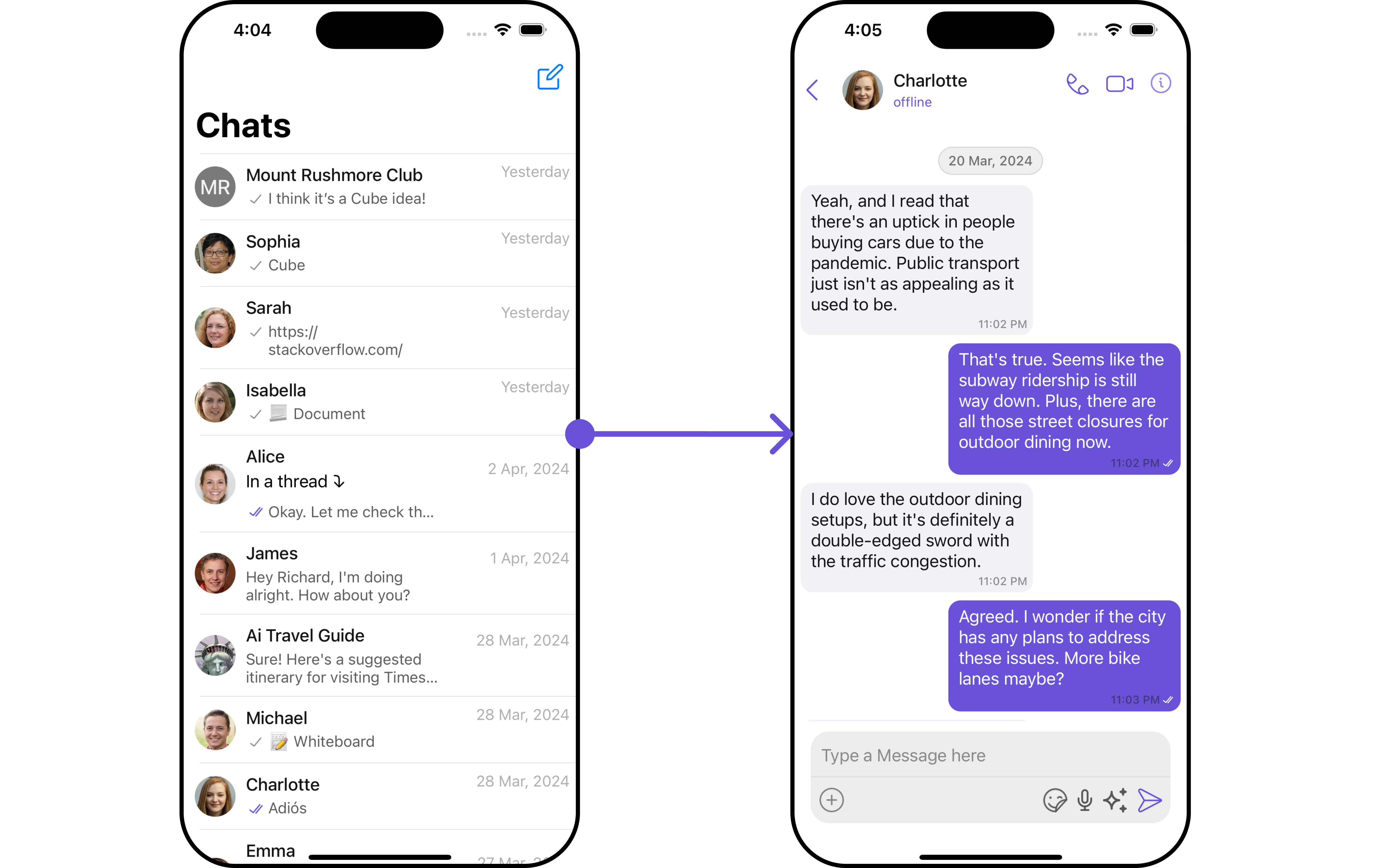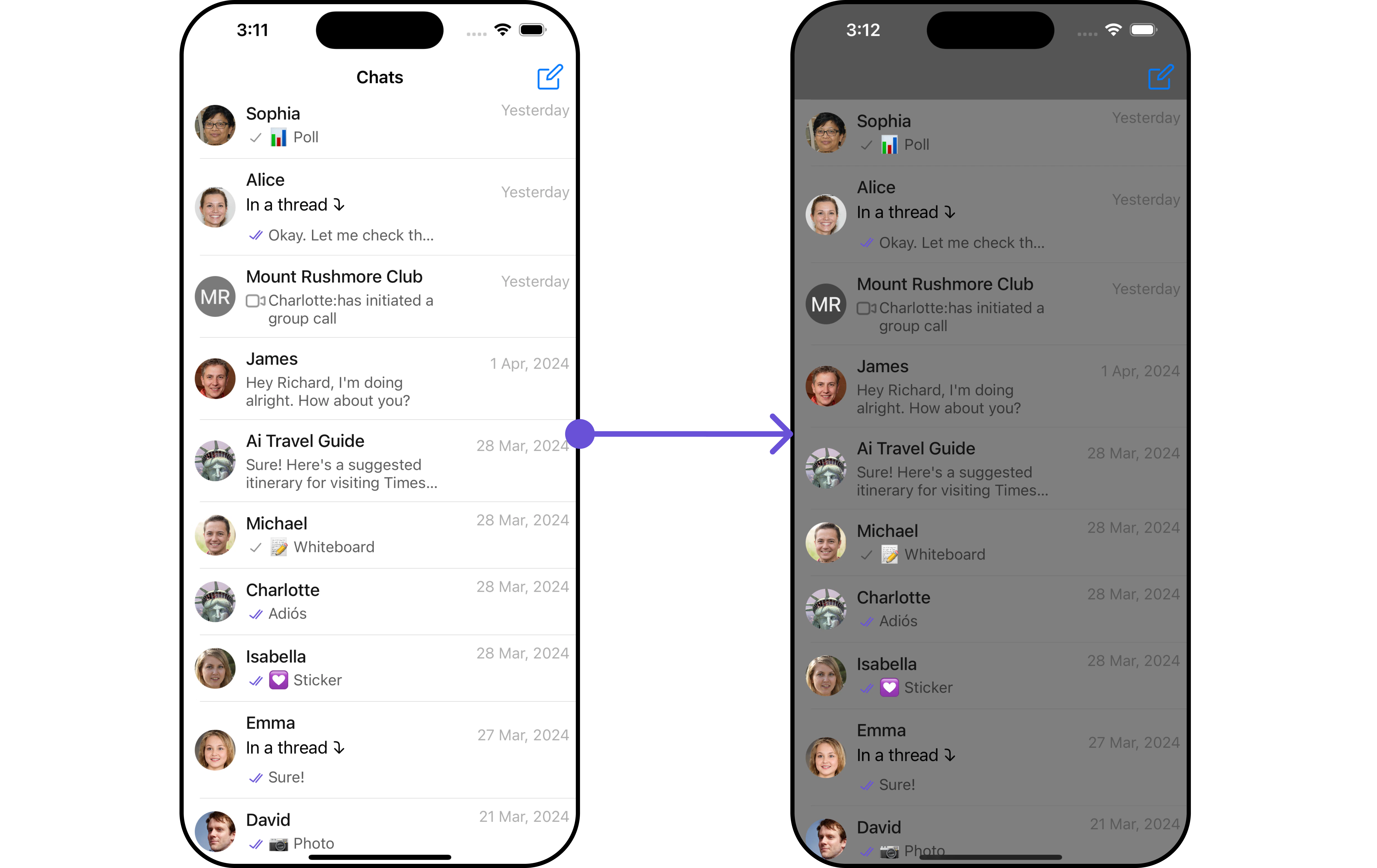 To fit your app’s design requirements, you have the ability to customize the appearance of the ConversationsWithMessages component. We provide exposed methods that allow you to modify the experience and behavior according to your specific needs.
