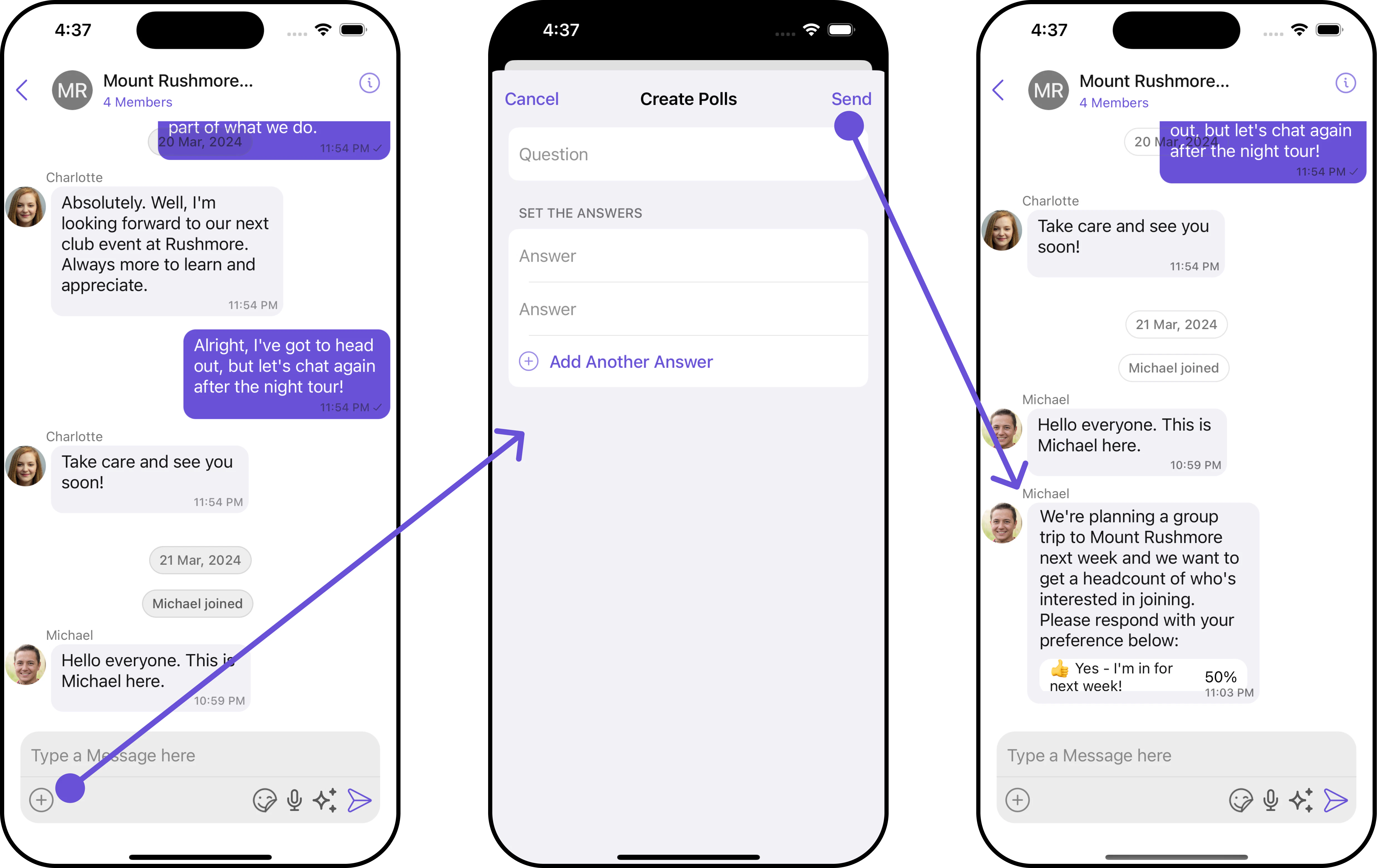 The Polls extension enhances group discussions by allowing users to create polls. Users can ask questions with a predefined list of answers, enabling a quick, organized way to gather group opinions. For a comprehensive understanding and guide on implementing and using the Polls Extension, refer to our specific guide on the Polls Extension. Once you have successfully activated the Polls Extension from your CometChat Dashboard, the feature will automatically be incorporated into the Action Sheet of the Message Composer component of UI Kits.