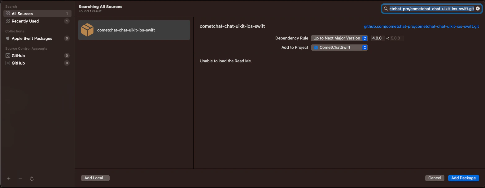 CometChatUIKitSwiftinto yourPackage Repositoryas below: