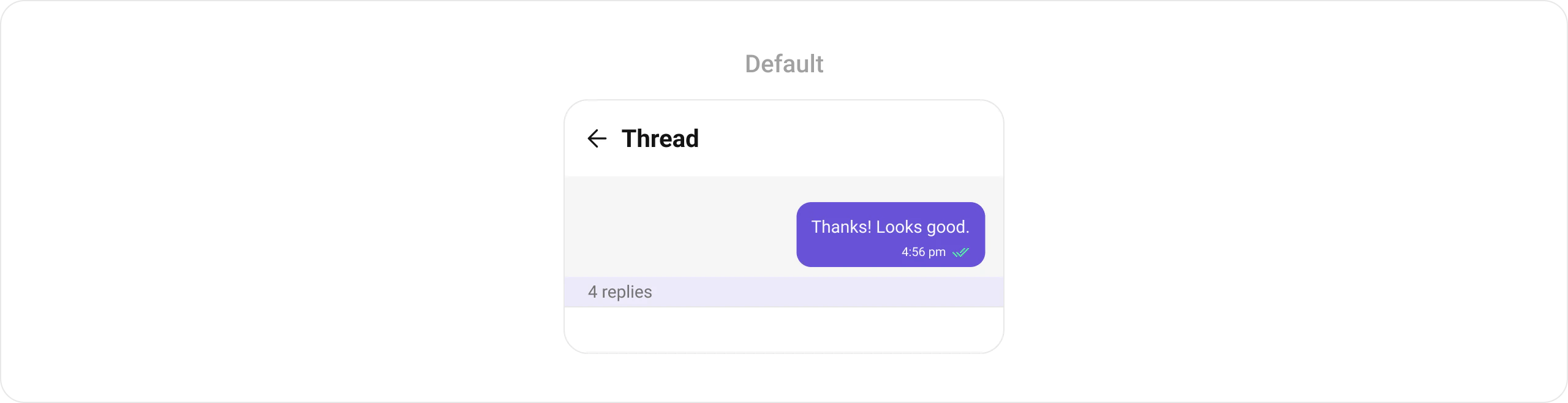 | parentMessage | Used to to set the message for which the replies need to be fetched | parentMessage={messageObject} |