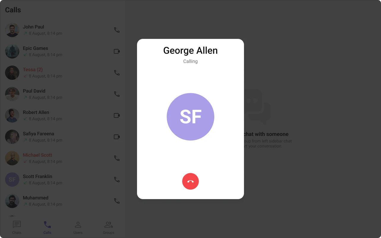 After adding this dependency, the React UI Kit will automatically detect it and activate the calling features. Now, your application supports both audio and video calling. You will see CallButtons component rendered in MessageHeader Component.