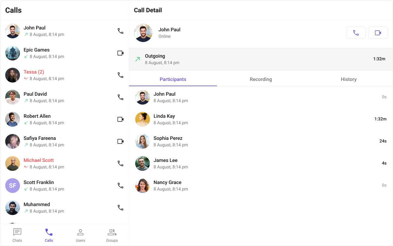 Call Logs component provides you with the records call events such as who called who, the time of the call, and the duration of the call. This information can be fetched from the CometChat server and displayed in a structured format for users to view their past call activities.