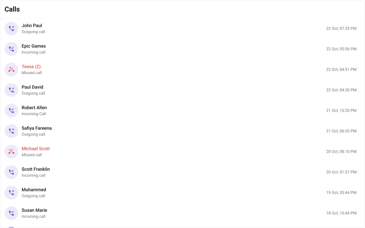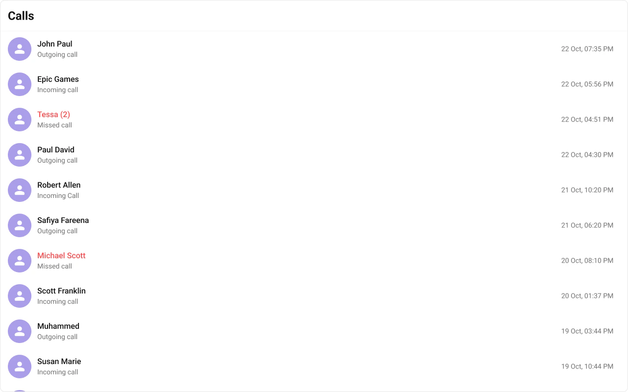 To fit your app’s design requirements, you can customize the appearance of the Call Logs component. We provide exposed methods that allow you to modify the experience and behavior according to your specific needs.Style