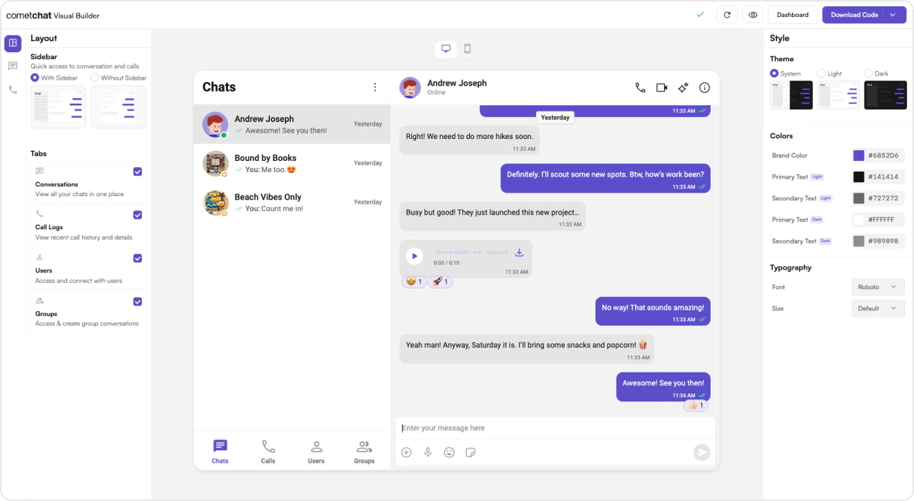 UI Kit Builder is a powerful tool designed to simplify the integration of CometChat’s UI Kit into your existing React application. With the UI Kit Builder, you can quickly set up chat functionalities, customize UI elements, and integrate essential features without extensive coding.
