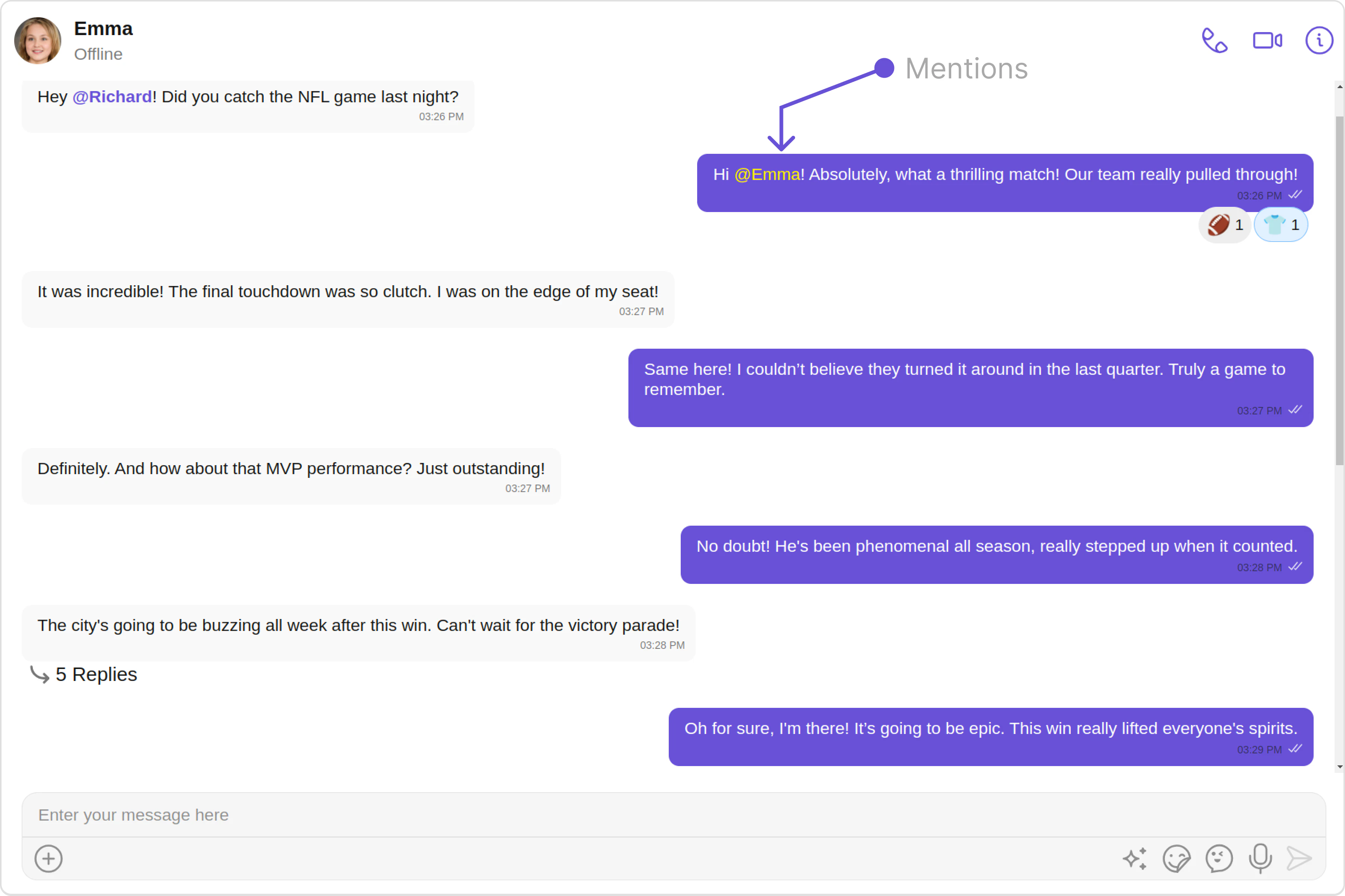 Mentions is a robust feature provided by CometChat that enhances the interactivity and clarity of group or 1-1 chats by allowing users to directly address or refer to specific individuals in a conversation.