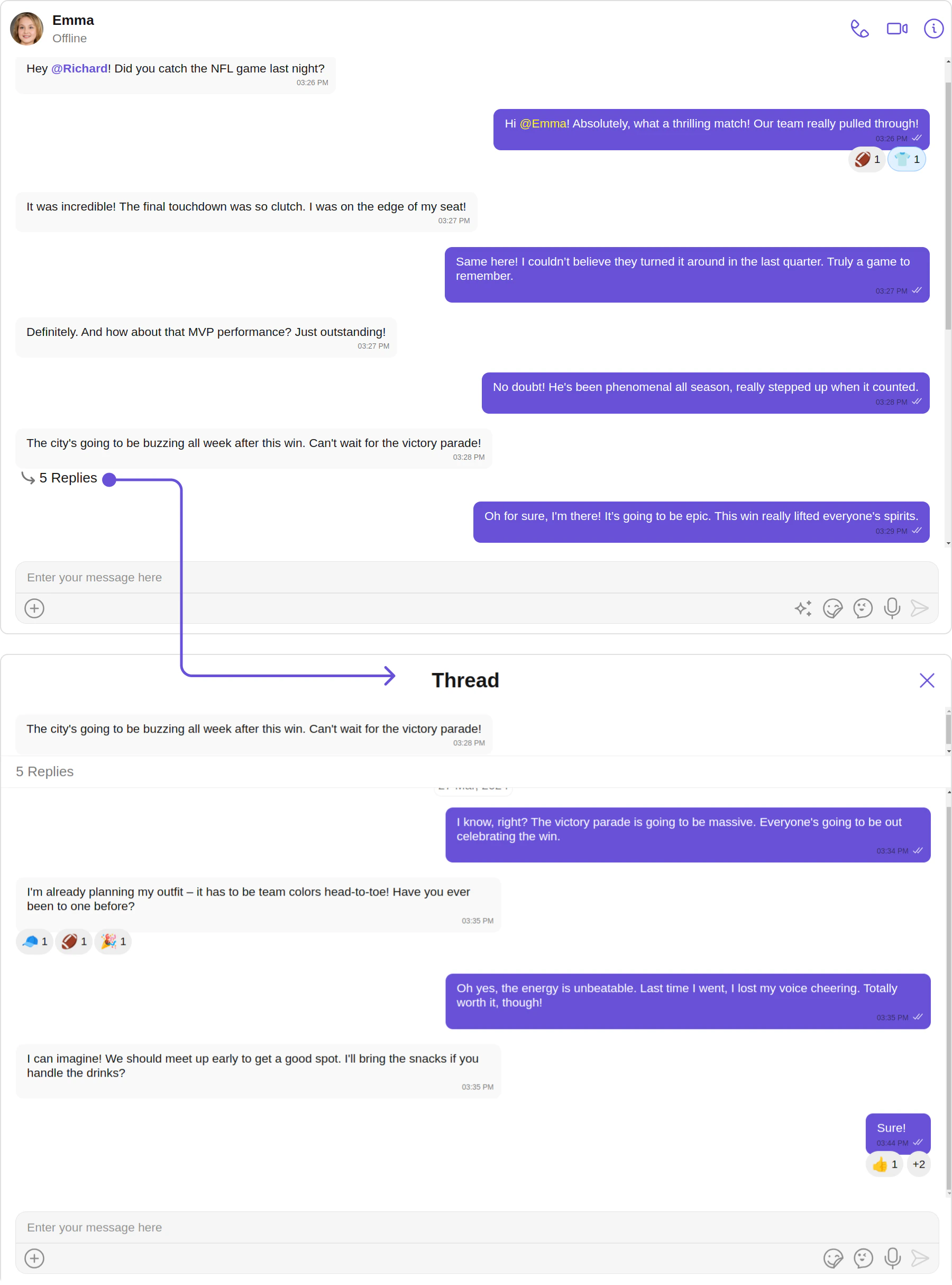 | Threaded Messages | Threaded Messages that displays all replies made to a particular message in a conversation. |