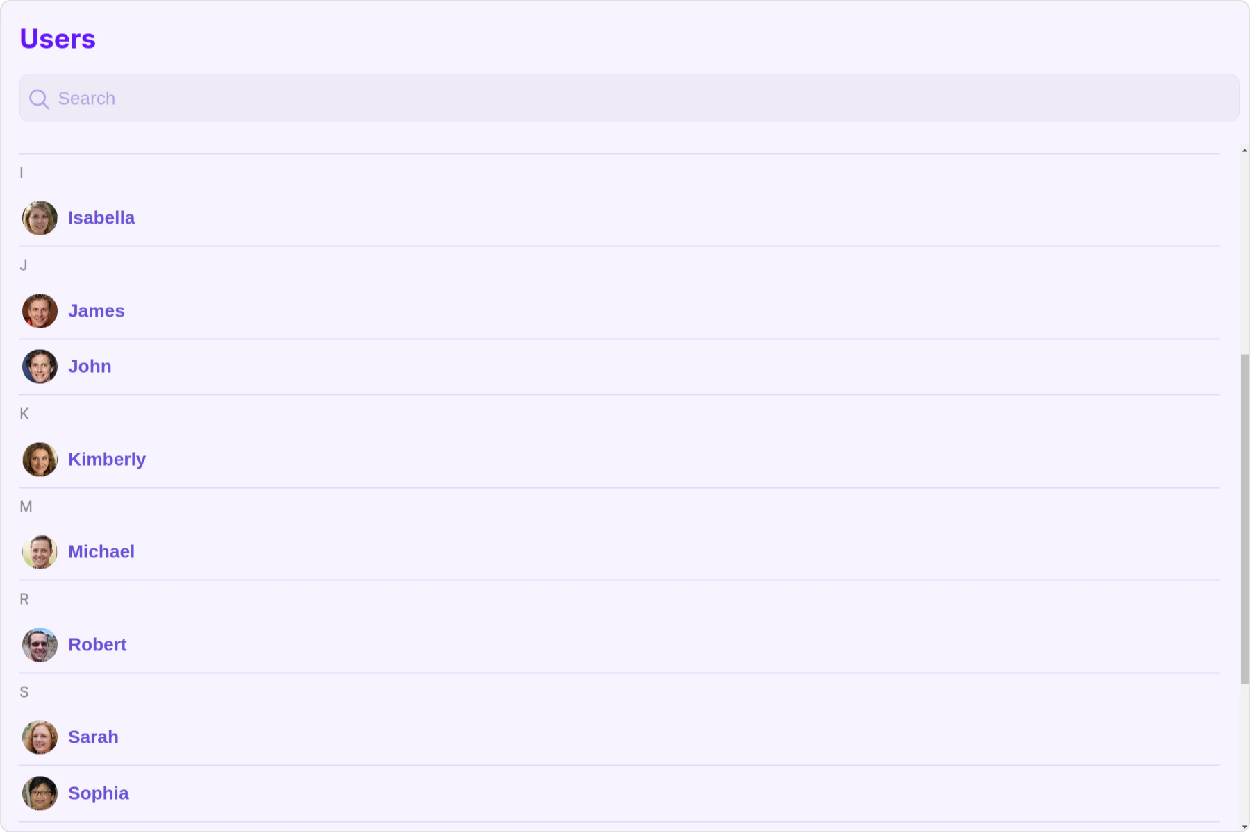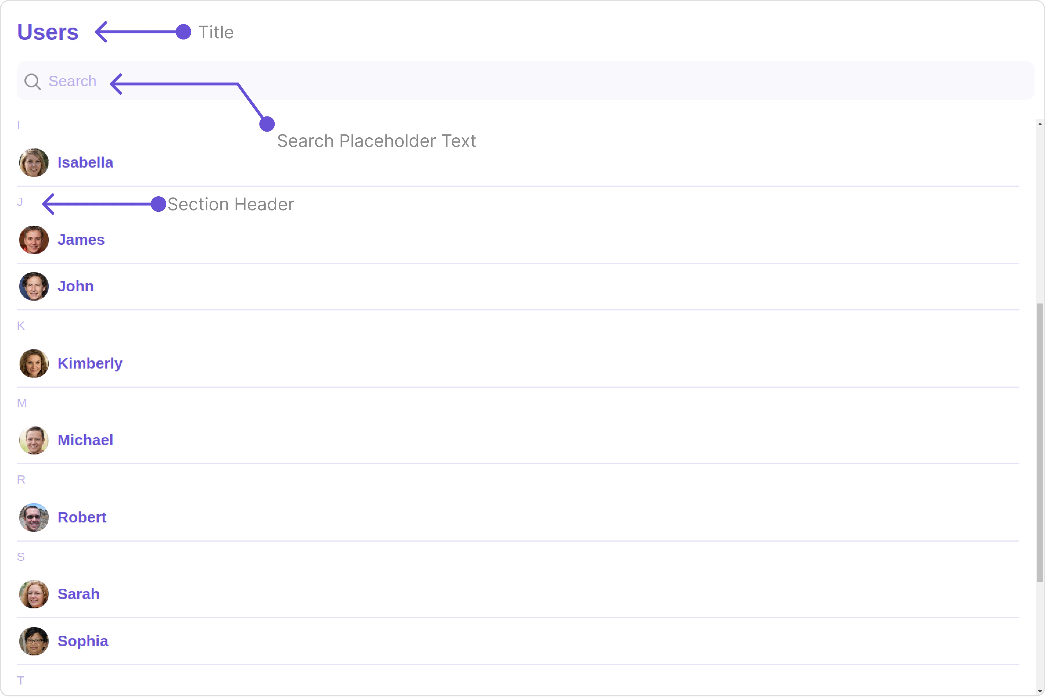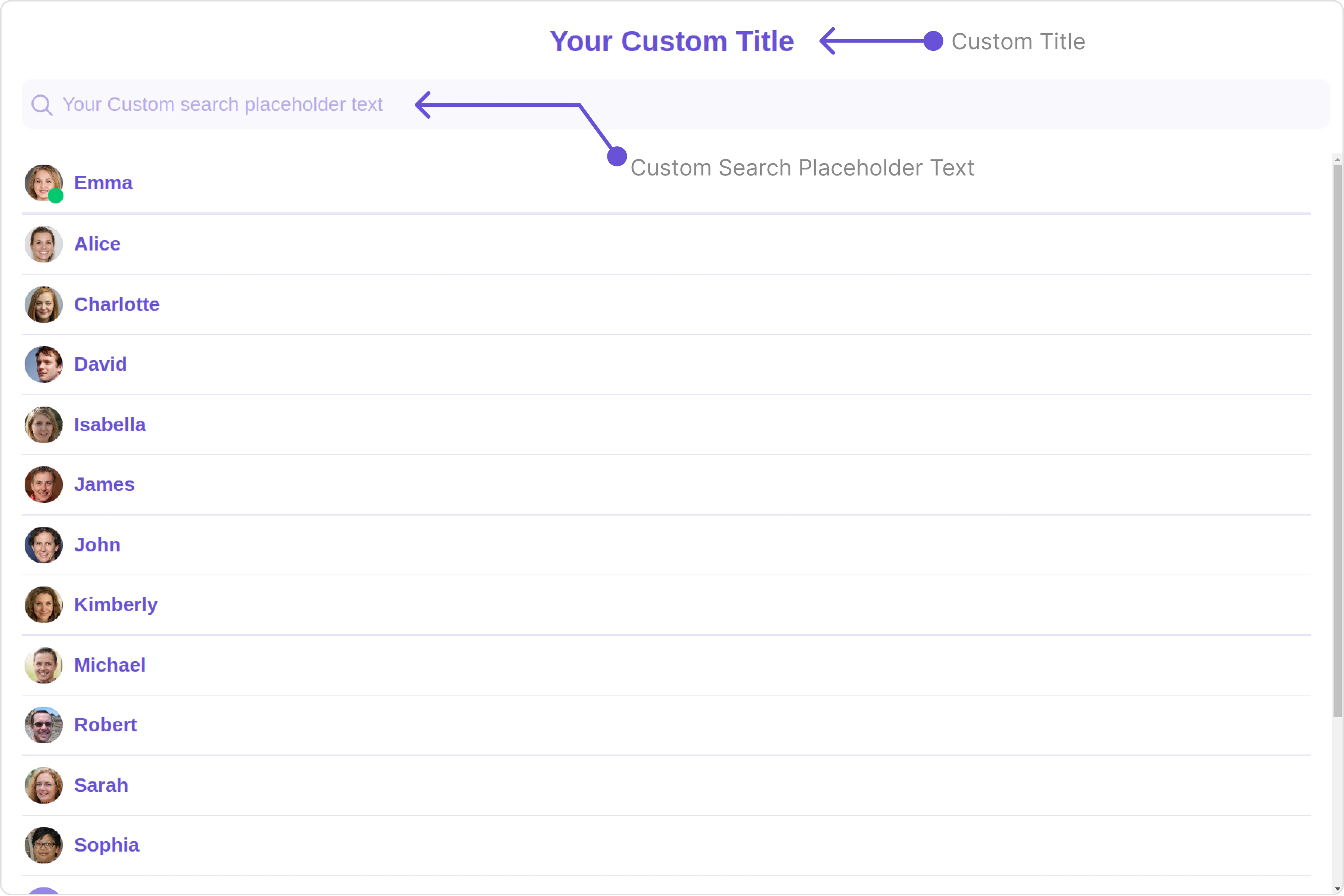 To fit your app’s design requirements, you can customize the appearance of the Users component. We provide exposed methods that allow you to modify the experience and behavior according to your specific needs.